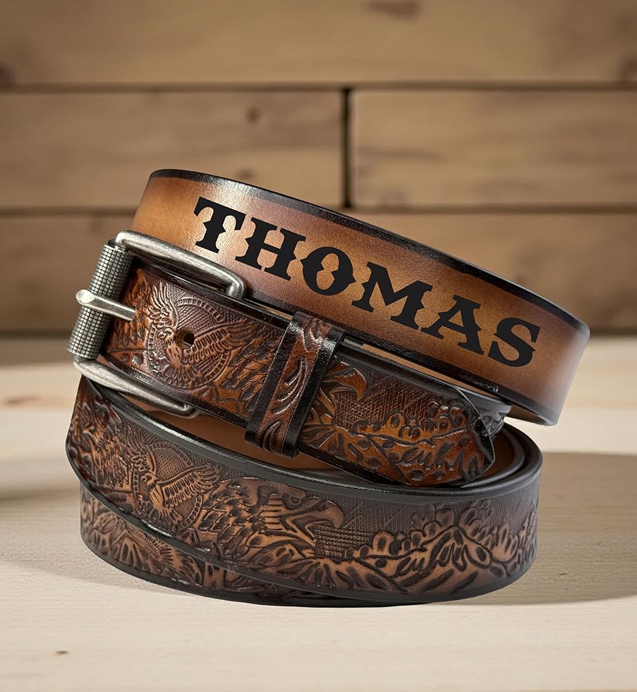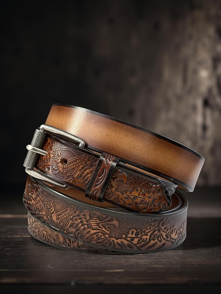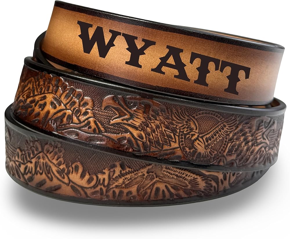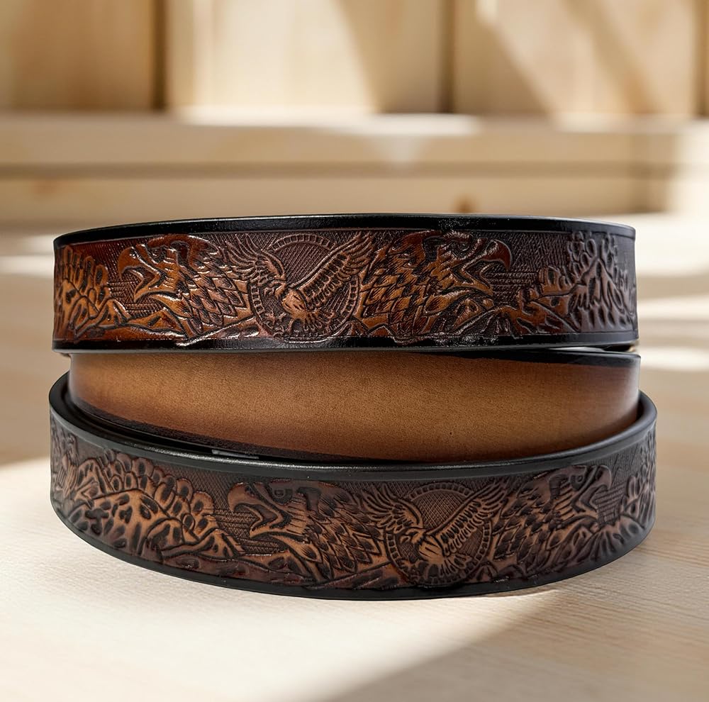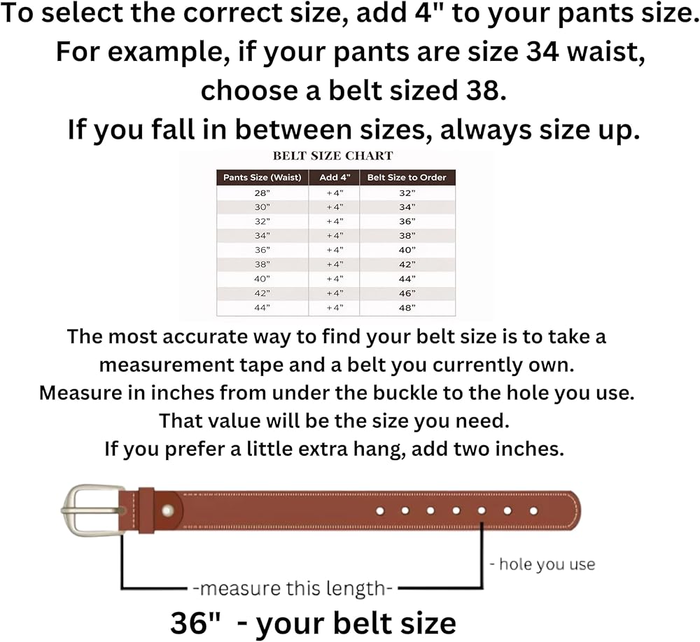 Material: - Full Grain Leather. This is the highest quality ONE PIECE leather, made from the top layer of the hide. It is thick, strong, and retains the natural grain, making it more durable and resistant to wear over time. - Heavy-duty construction ensures that the strap can withstand significant stress - Interchangeable Buckle: Featuring a stylish design with subtle detailing, this Western leather belt includes a convenient snap-on system, allowing you to easily swap out the buckle to match your style. Thickness: - The leather would be thick enough (3-4 mm) to handle the weight of large buckles, making it ideal for heavy-duty applications like utility belts, tool straps, or robust fashion accessories. Natural Patina: - Full-grain leather develops a beautiful patina over time with use, giving the strap a unique appearance that improves with age.