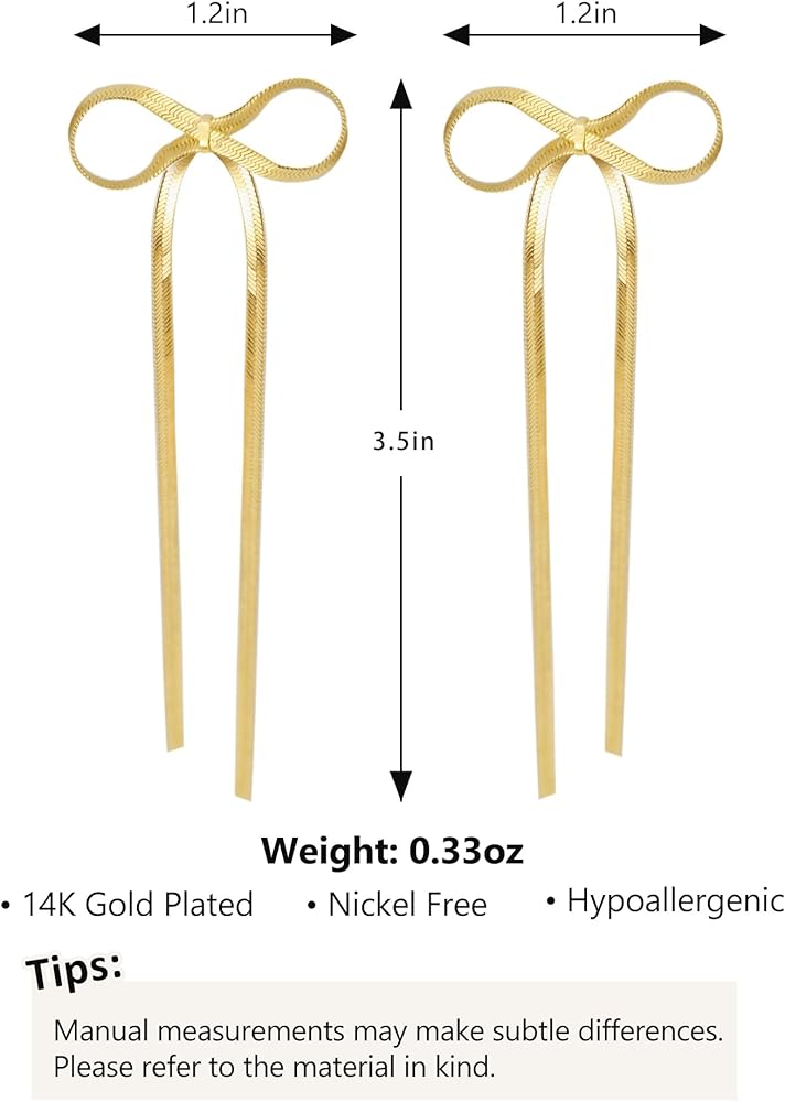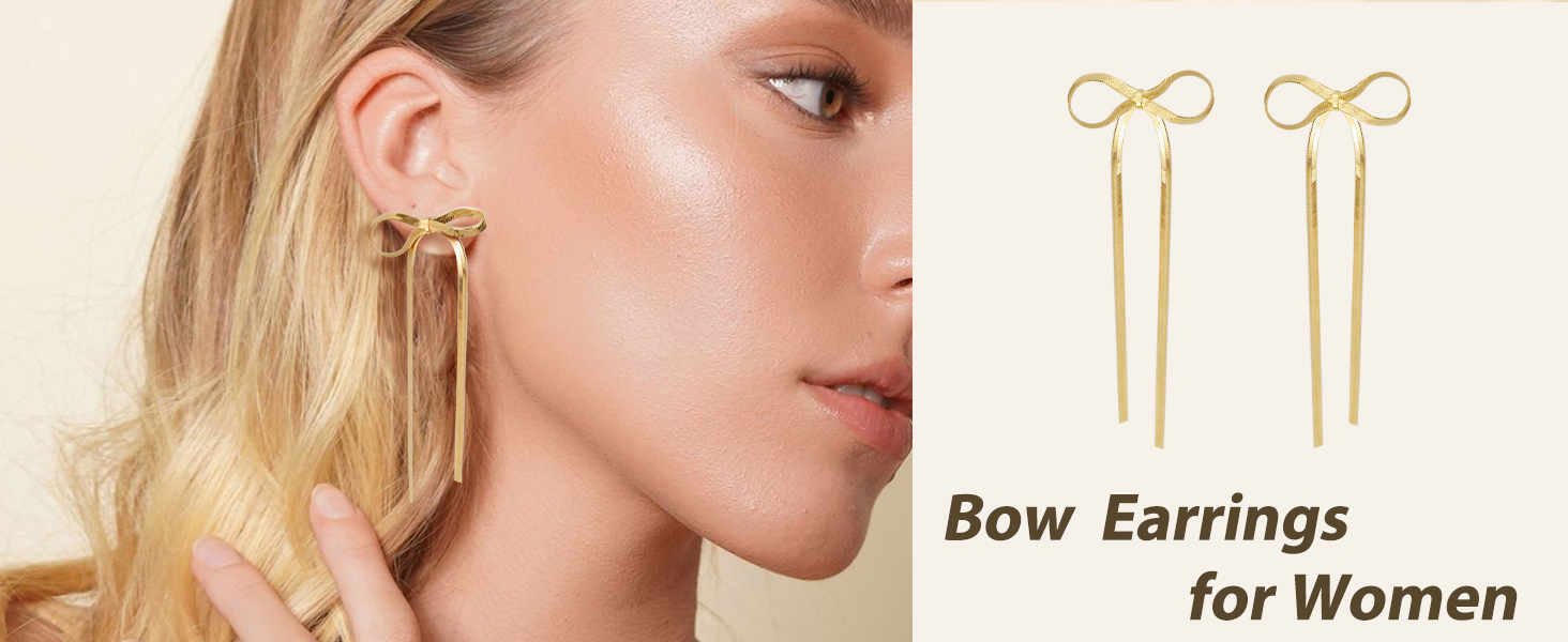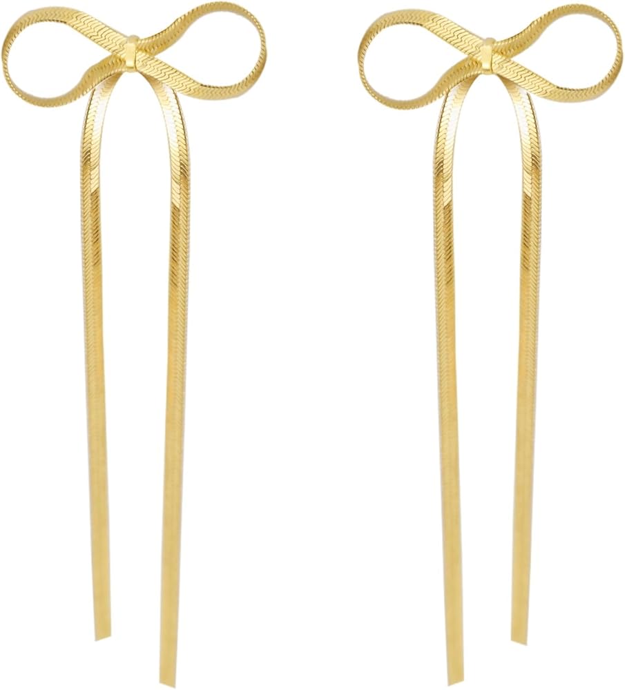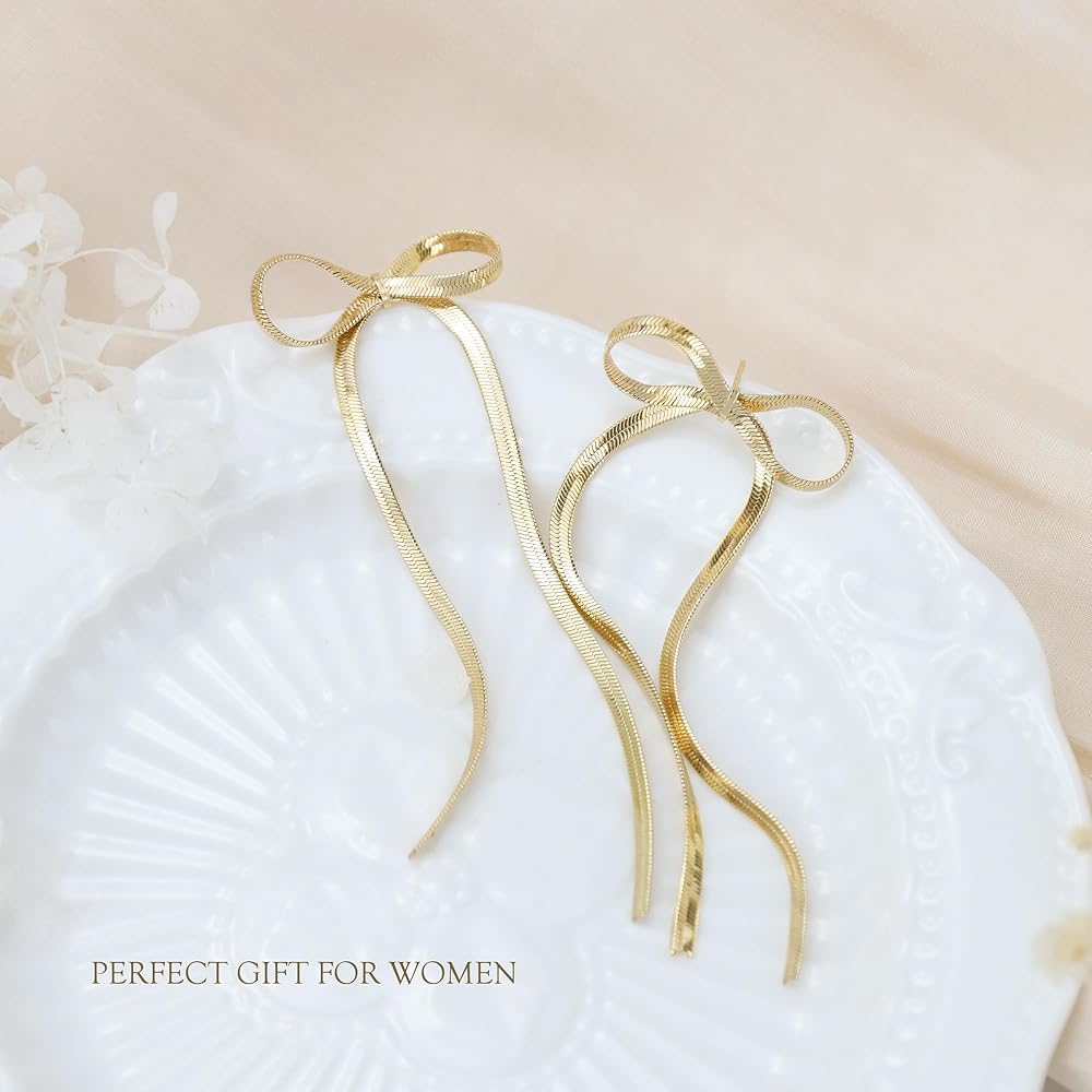 أقراط على شكل فيونكة ذهبية للنساء: هذه الأقراط على شكل القوس بشكل فريد ومصنوعة من سلسلة ثعبان أنيقة مع ذيلين شرابات رقيقتين، مما يضيف لمسة من الحركة والرقي، أقراط الشرابة ذات السلسلة الطويلة الرائعة لافتة للنظر وبراقة للغاية، وتظهر شخصيتك