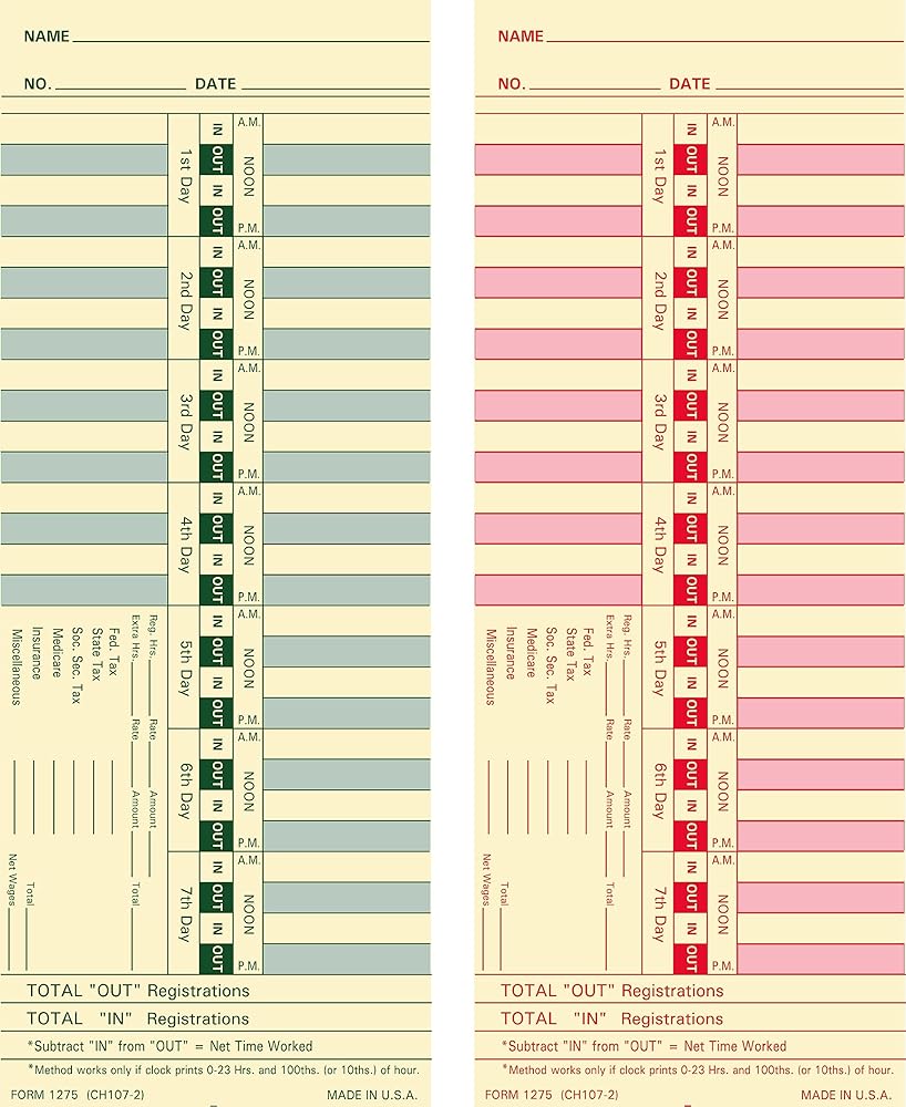 1275 Time Cards, Made in USA, 500-Count, Weekly, 2-Sided, 3 1/2 x 9, Manila Card Stock, Green & Red Print