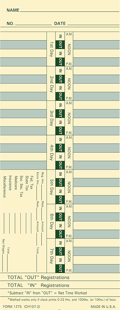 1275 بطاقة زمنية، مصنوعة في الولايات المتحدة الأمريكية، عدد 500، أسبوعيًا، على الوجهين، 3 1/2 × 9، مخزون بطاقات مانيلا، طباعة باللونين الأخضر والأحمر