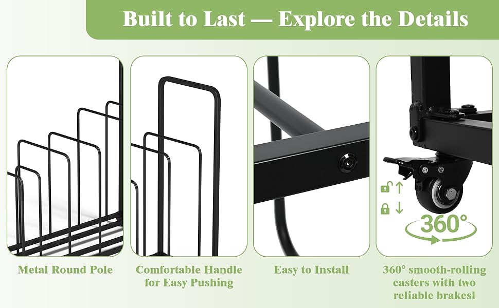 التجميع السريع والسهل: يأتي مع الأجزاء الرئيسية للإعداد البسيط - فقط قم بتوصيل العجلات والأعمدة الجانبية. يمكن لشخص واحد تجميع هذا الرف القائم بذاته في دقائق باستخدام الأدوات