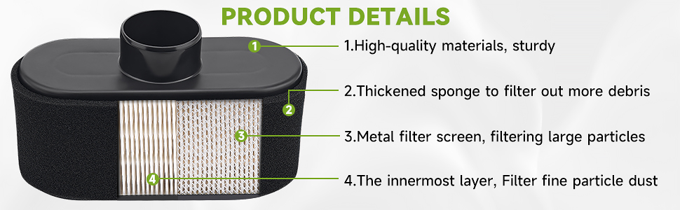 ميزات المنتج وأدائه: تشتمل جميع المجموعات على 4 مرشحات هواء و8 مرشحات مسبقة إسفنجية. وهي مجهزة بشبكة معدنية معززة لمنع التشوه. يوفر التصميم المطوي الموحد أداءً ممتازًا للترشيح، وقادرًا على التقاط المزيد من الغبار والحطام.