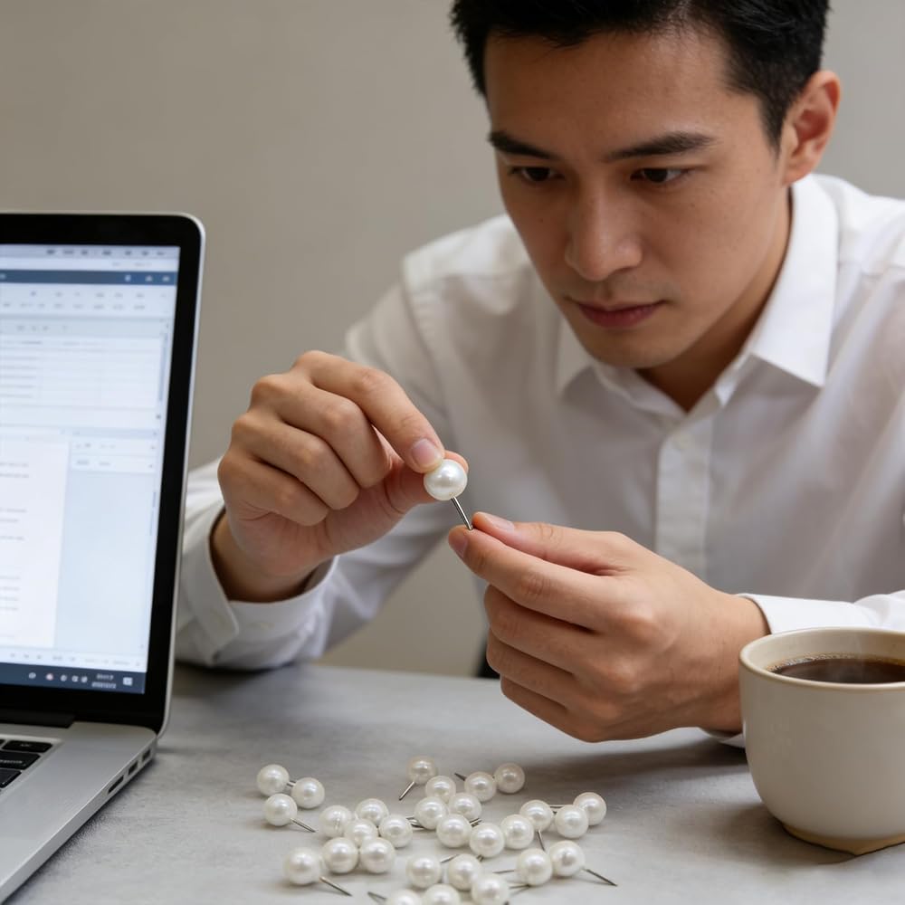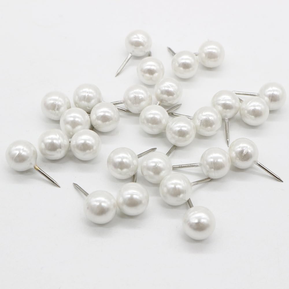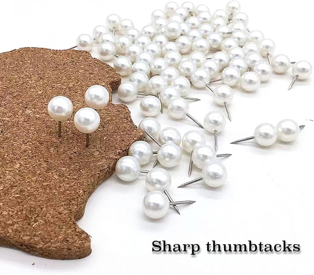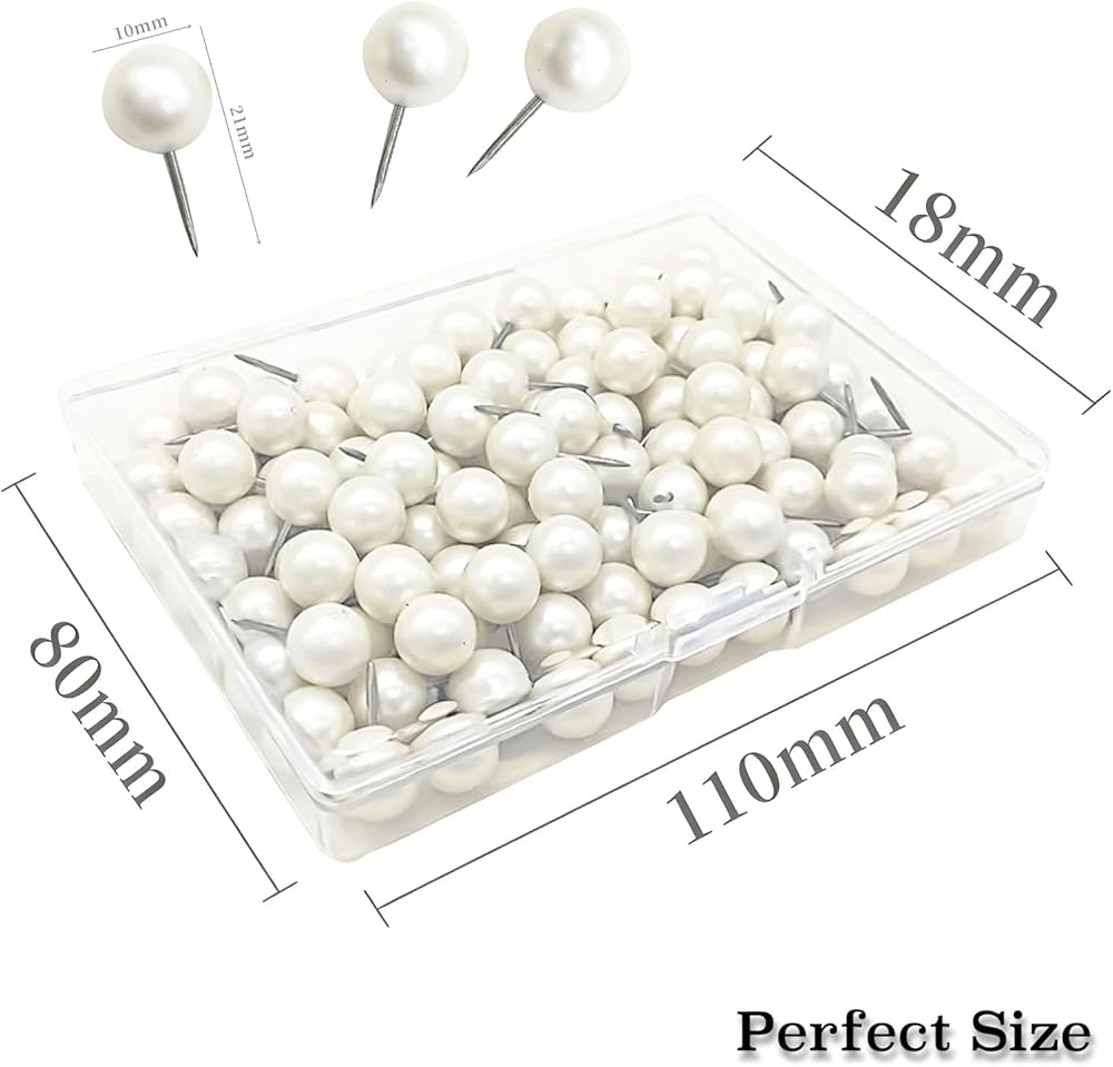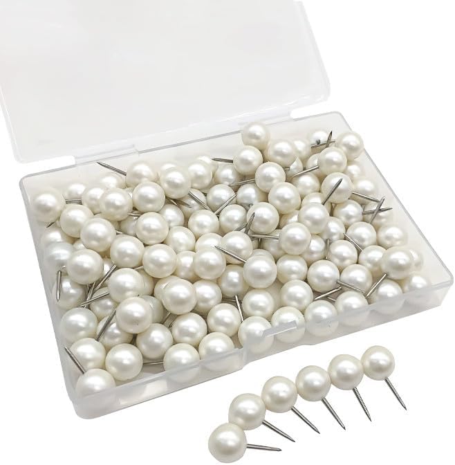 Stay organized and stylish with these 100 pearl white push pins – the perfect addition to any home, office, or classroom. Their vibrant round heads add a touch of elegance while keeping your bulletins, documents, photos, and lightweight decorations securely in place. Designed for comfort and durability, each pin features a 0.4" ball diameter and 0.4" needle, slightly larger than standard pins, with strong steel tips that resist bending. The pearl white plastic heads are fade-resistant and long-lasting, making every push effortless. These pins are versatile and multi-purpose, ideal for corkboards, noticeboards, photo walls, or even decorative projects like hanging string lights or small ornaments. Neatly packed in a box of 100, they're ready whenever you need them. Bring both function and style to your space – keep items organized, projects on track, and boards clutter-free. Perfect for home, school, or office, these push pins combine practicality with a subtle, classy touch.