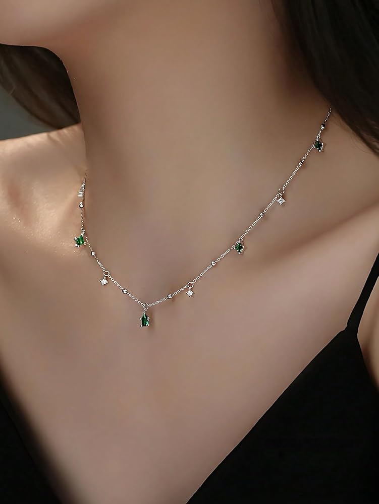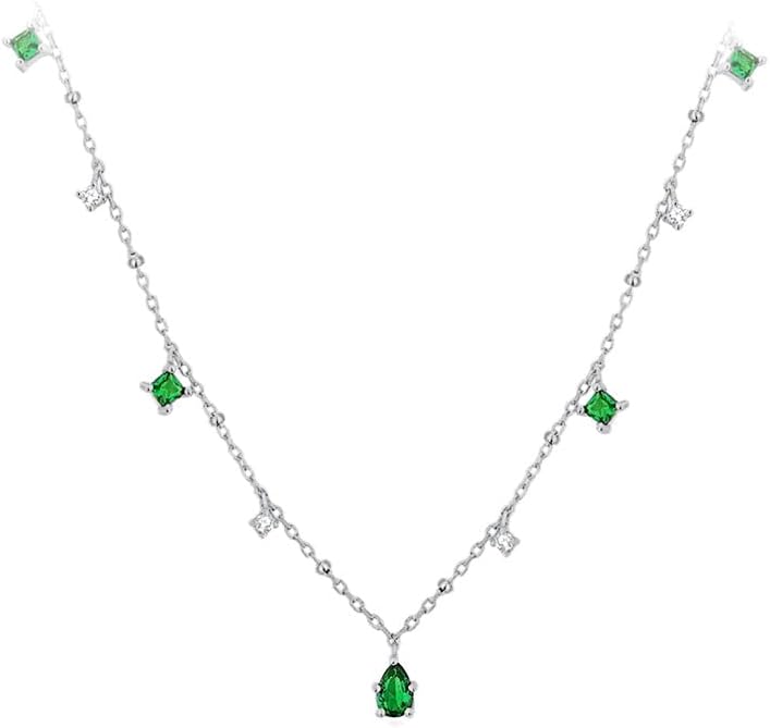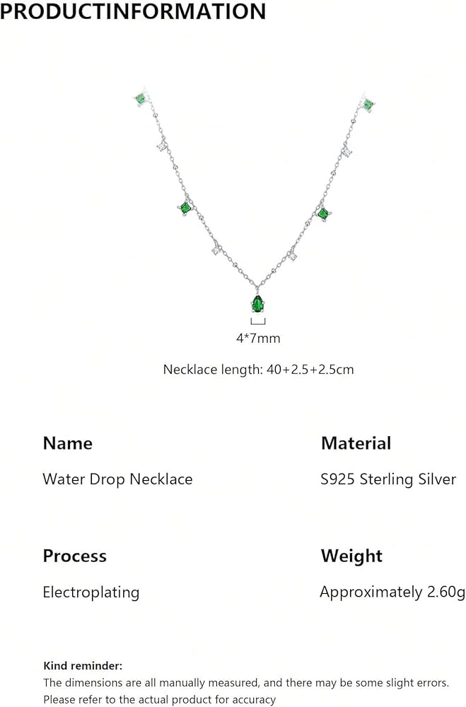 Crafted from sterling S925 sterling silver, this delicate teardrop necklace features an elegant square-cut green zircon and teardrop pendant. The necklace measures approximately 17.7 inches (45 cm) long and is adjustable in length to fit around different necklines. Each green crystal is precisely positioned along the chain and is complemented by subtle clear accents that catch and reflect the beautiful light. Weighing only 2.60 grams, it is elegant on the collarbone and comfortable for all-day wear. The electroplating process ensures durability while maintaining the natural luster of the silver. The central teardrop shaped stone measures 4x7mm in diameter and has just the right amount of sparkle to not overpower your ensemble. Please note that sizes are hand-measured and may vary slightly.