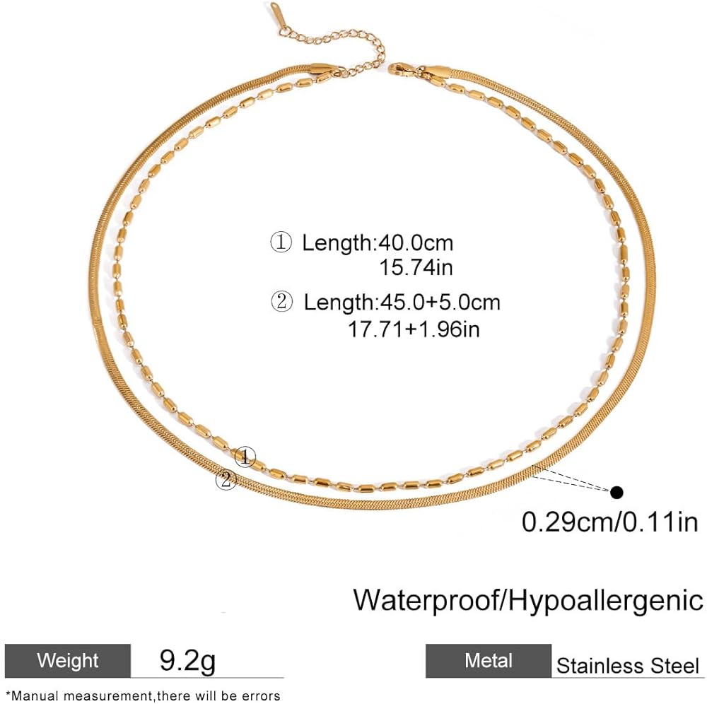 نمط متعدد الاستخدامات: مثالية لكل من الملابس الكاجوال والرسمية، هذه القلادات ذات الطبقات المزدوجة تضيف لمسة من الرقي إلى أي ملابس. القياسات: سلسلة الثعبان: 45 سم + 5 سم (17.71 بوصة مع سلسلة تمديد 1.96 بوصة)، العرض 2.9 مم (0.11 بوصة)؛ سلسلة الخرز: 40 سم (15.74 بوصة)؛ الوزن الإجمالي: 9.2 جرام