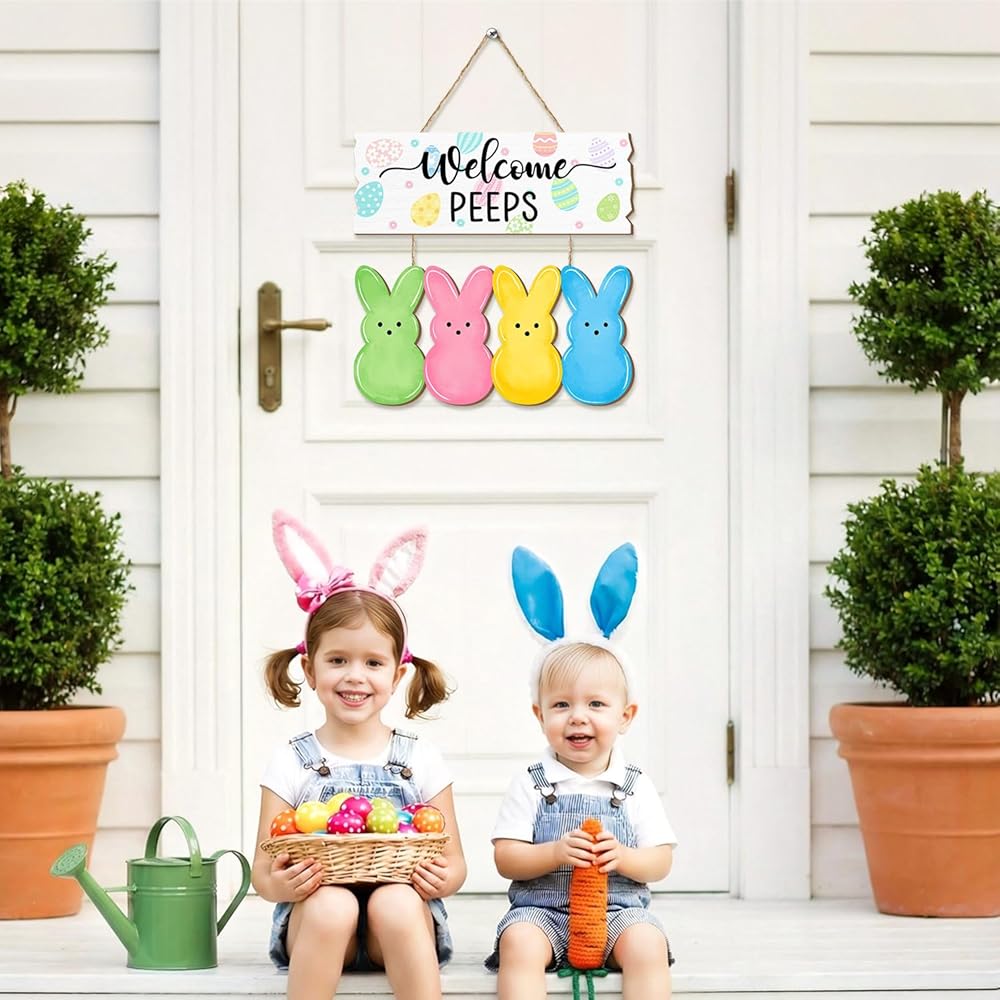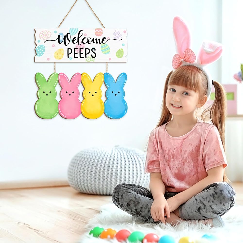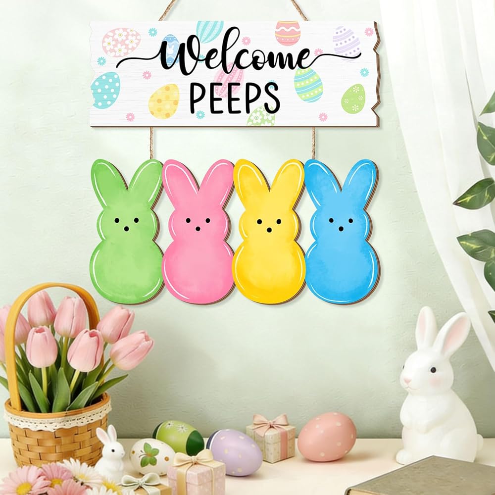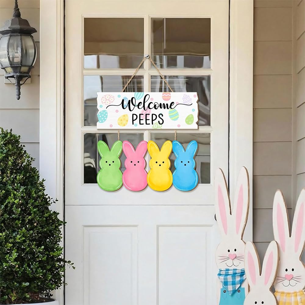Welcome the Easter season with this charming wooden door sign featuring adorable bunny peeps! This delightful hanging decoration showcases a cheerful "Welcome PEEPS" message adorned with colorful Easter eggs, accompanied by four vibrant bunny silhouettes in green, pink, yellow, and blue.