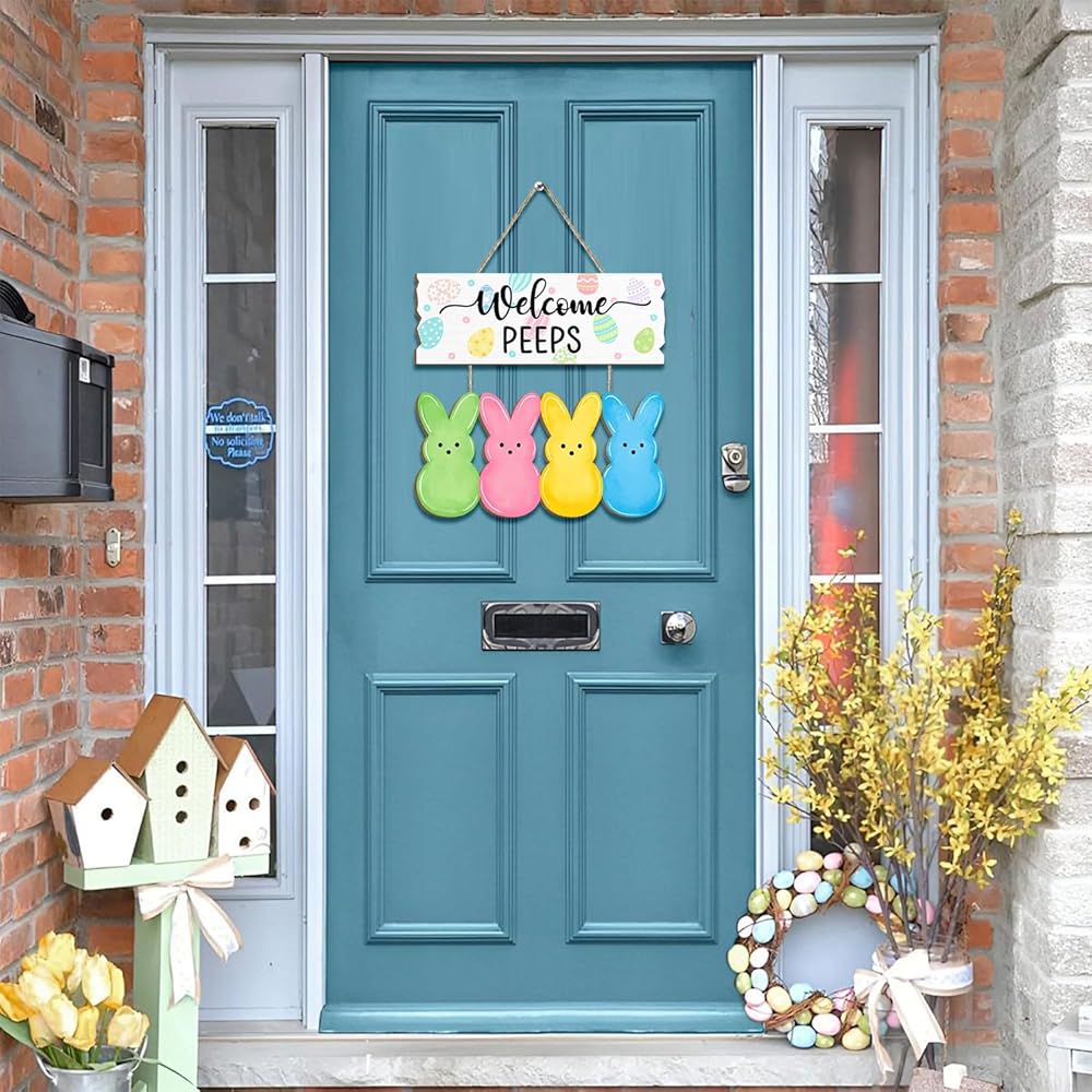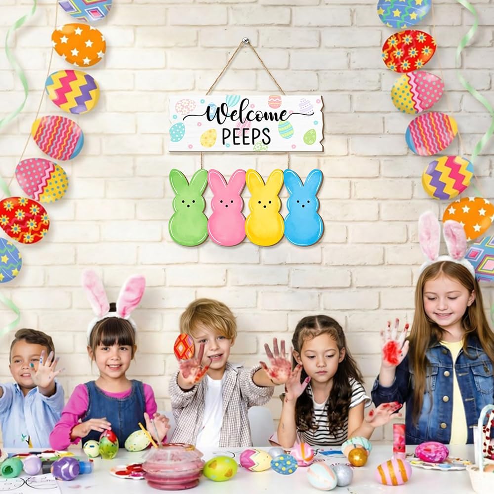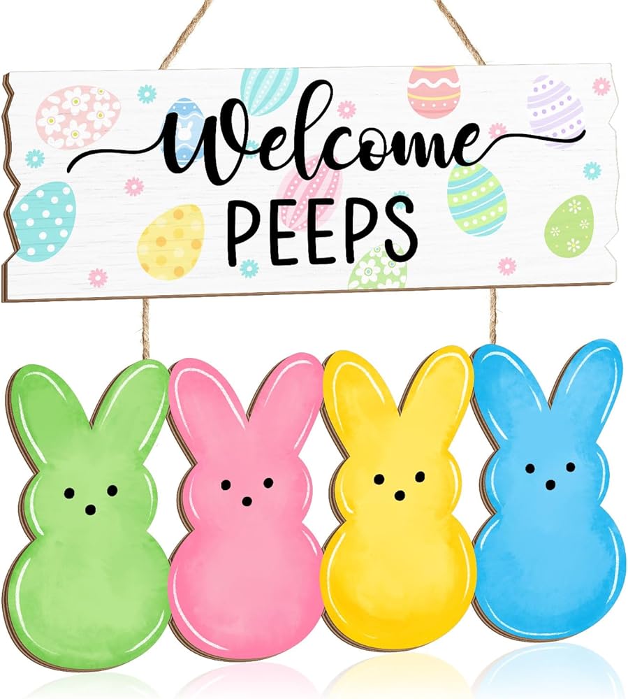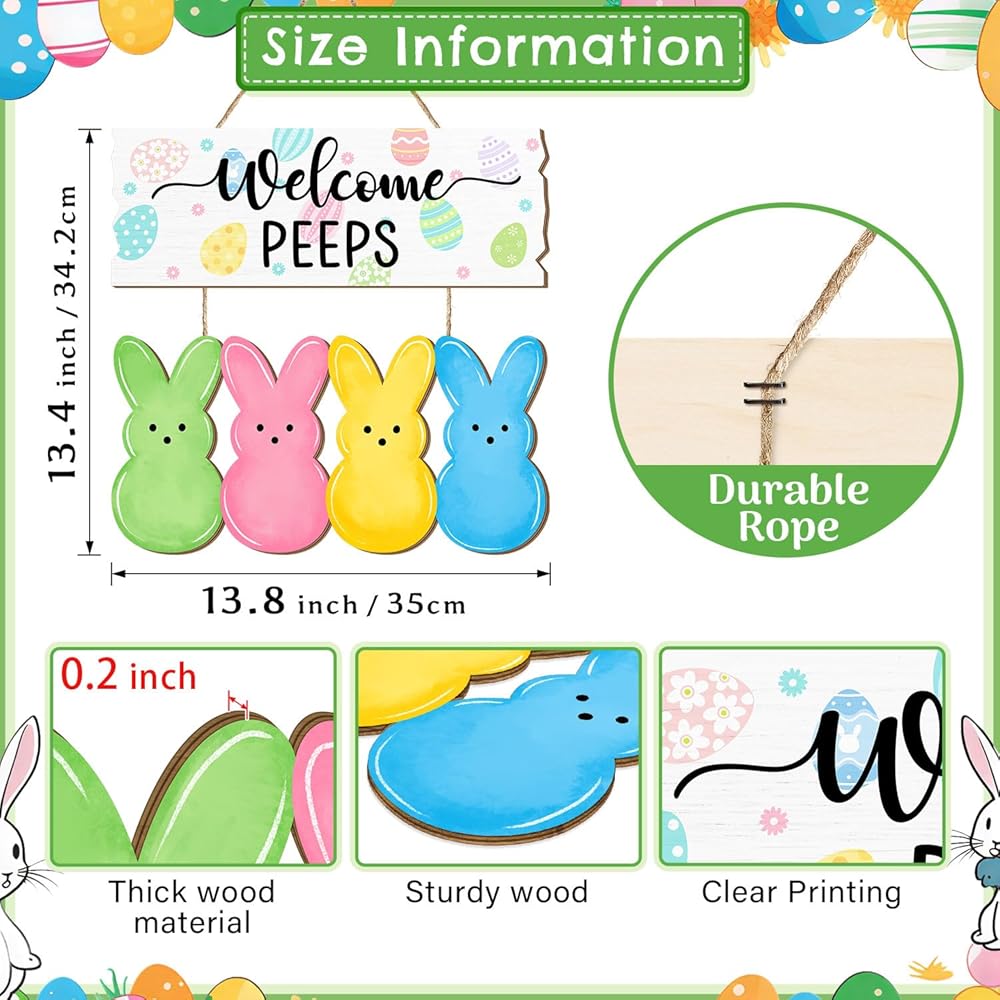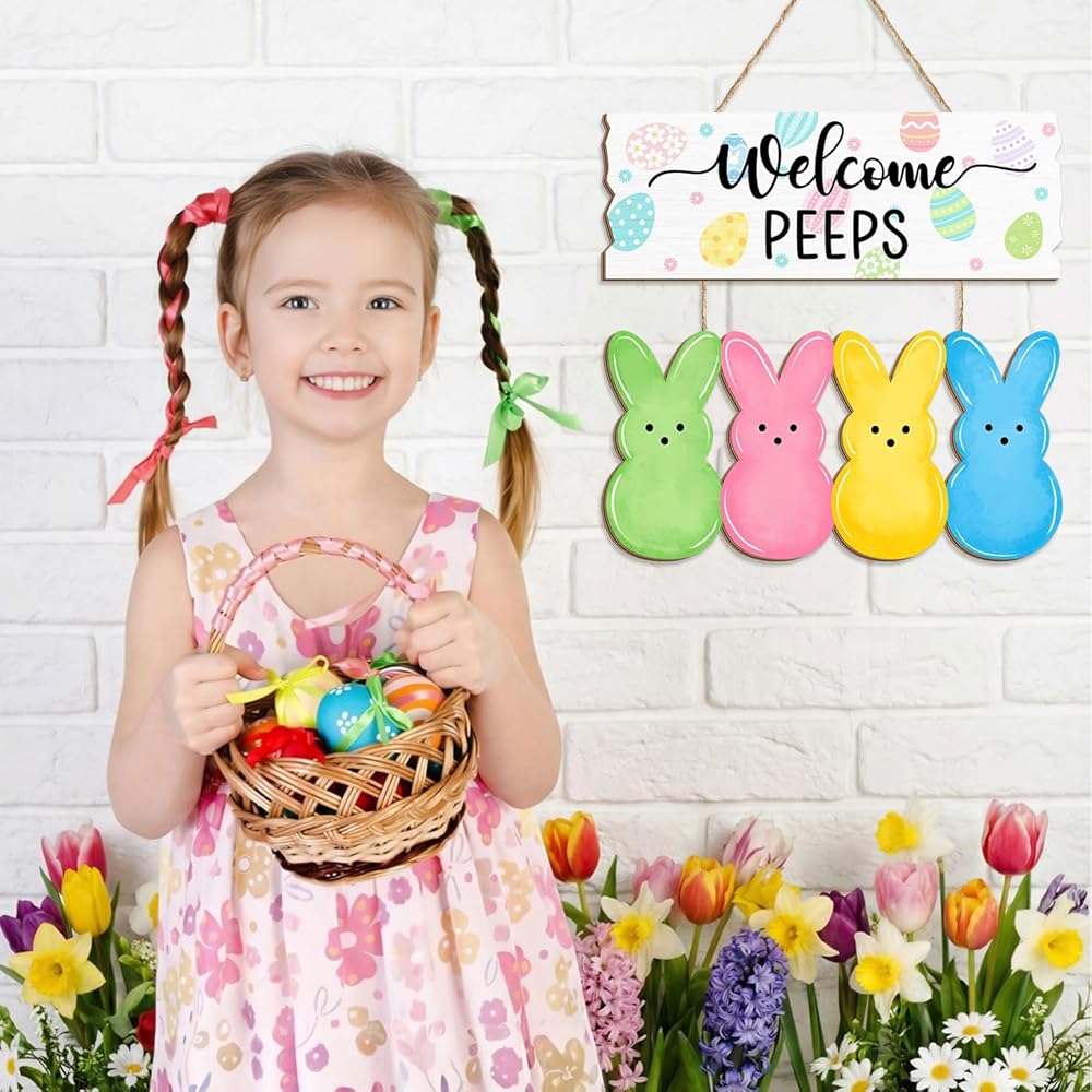 Welcome the Easter season with this charming wooden door sign featuring adorable bunny peeps! This delightful hanging decoration showcases a cheerful "Welcome PEEPS" message adorned with colorful Easter eggs, accompanied by four vibrant bunny silhouettes in green, pink, yellow, and blue.