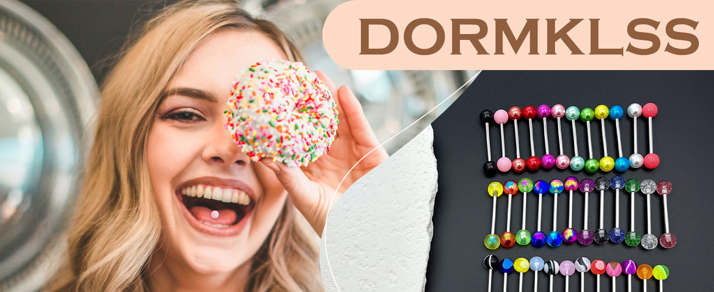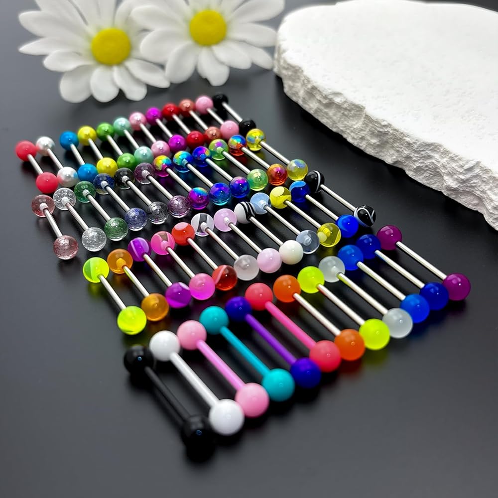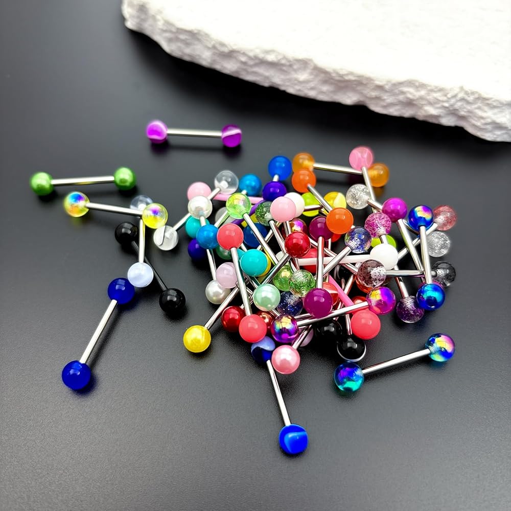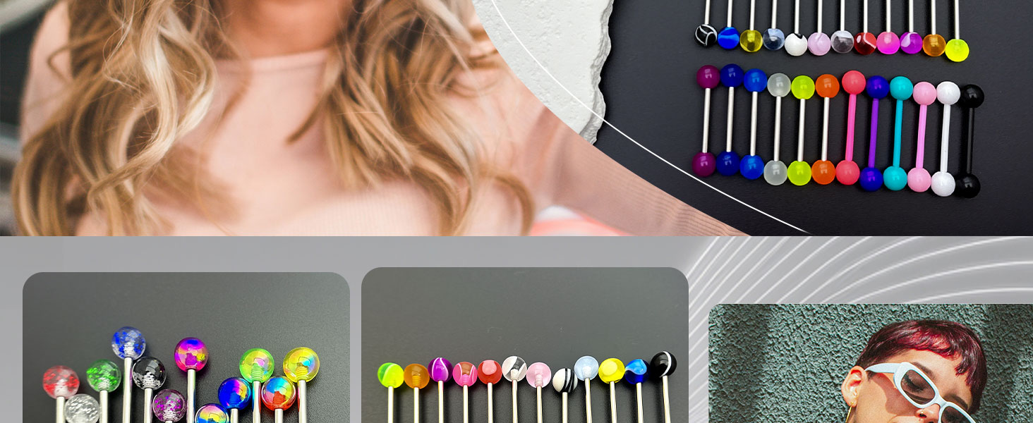 Tongue Piercing Jewelry Material: These lovely and colorful tongue piercing jewels are made of high-quality stainless steel and acrylic materials, which are safe and tough and don't worry about breaking. Tongue jewelry surgical steel are friendly to the oral cavity, even if it is in contact with the body for a long time, it will not cause discomfort, so that you can easily show your personality all day
