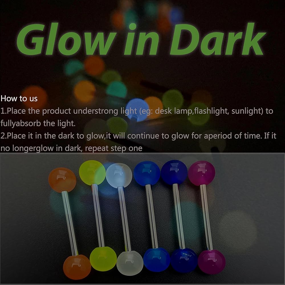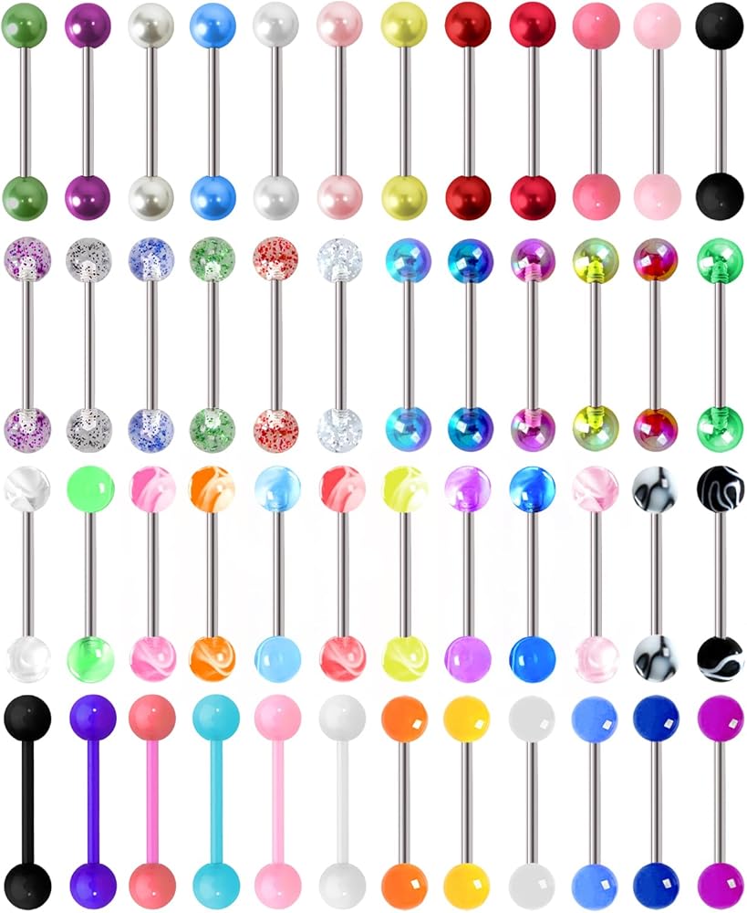 Tongue Rings Barbells: The tongue rings set contains 48 personalized tongue piercings of 6 styles, namely 12 imitation pearl tongue rings, 6 multicolor sequined tongue rings, 6 candy-colored tongue rings, 12 moire tongue rings, 6 acrylic tongue rings and 6 luminous tongue rings. A tongue jewelry set contains a variety of tongue nail experiences, which brings you a variety of safety personality experiences