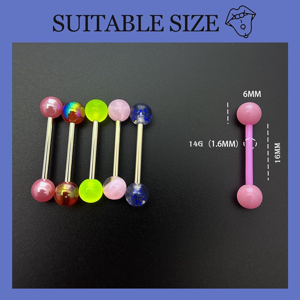 Candy Color Tongue Rings Size: Gauge 14G(1.6 mm), rod length: 0.63 inch (16 mm), ball diameter 6mm, suitable for all ladies who want to show their individuality. Tongue ring with suitable length and tough material can be worn easily and comfortably without worrying about the risk of fracture. The two ends of the tongue piercings are easy to screw on and off, so you don't have to worry about the ball falling off