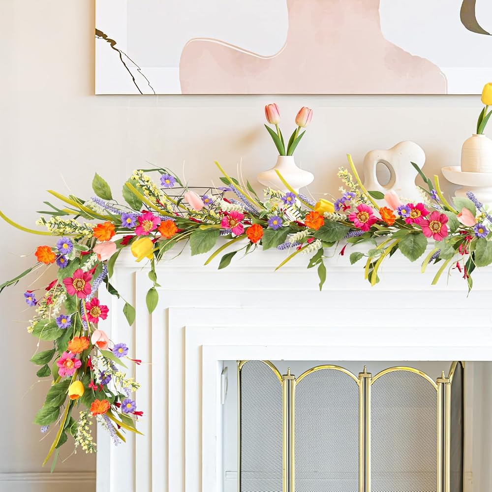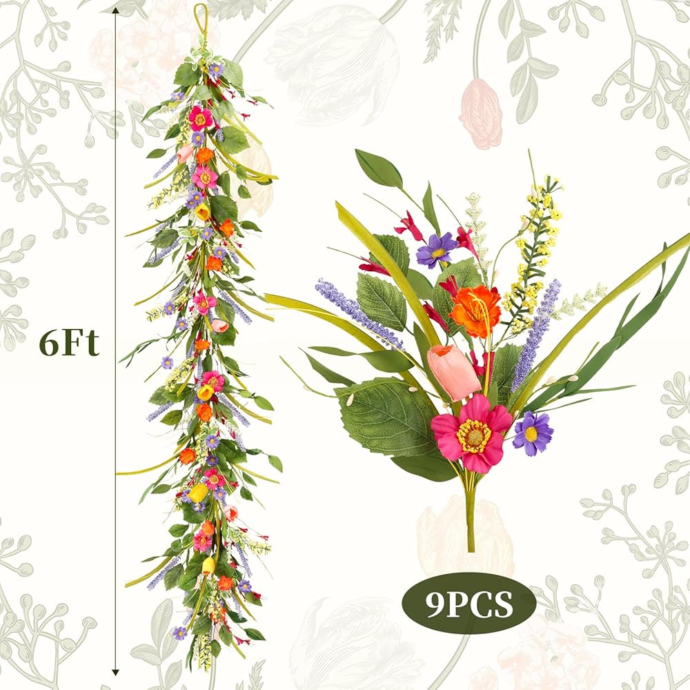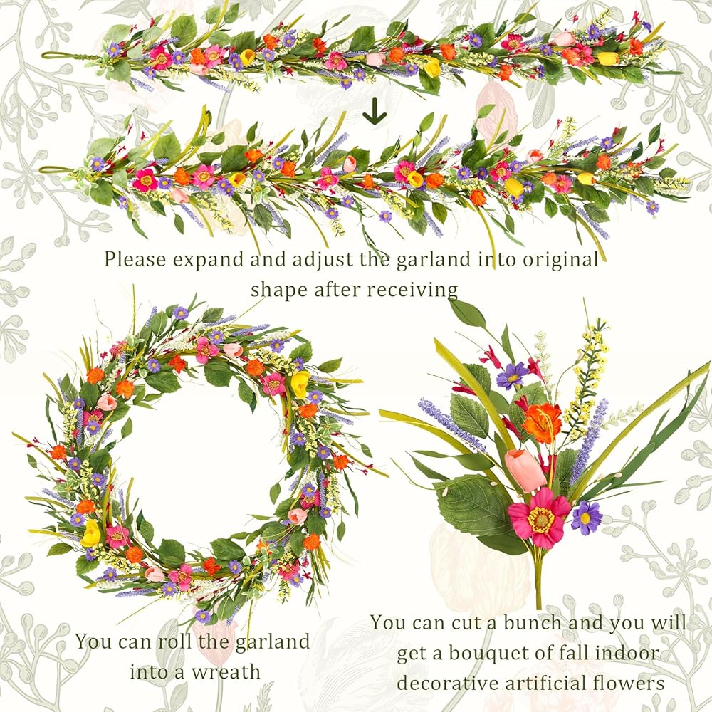 HOHOTIME زهرة التوليب إكليل مع الخزامى، 6FT زهور الربيع الاصطناعية فاينز لشرفة الزفاف درج ديكور داخلي، زهرة برية وهمية عيد الفصح ديكور المنزل