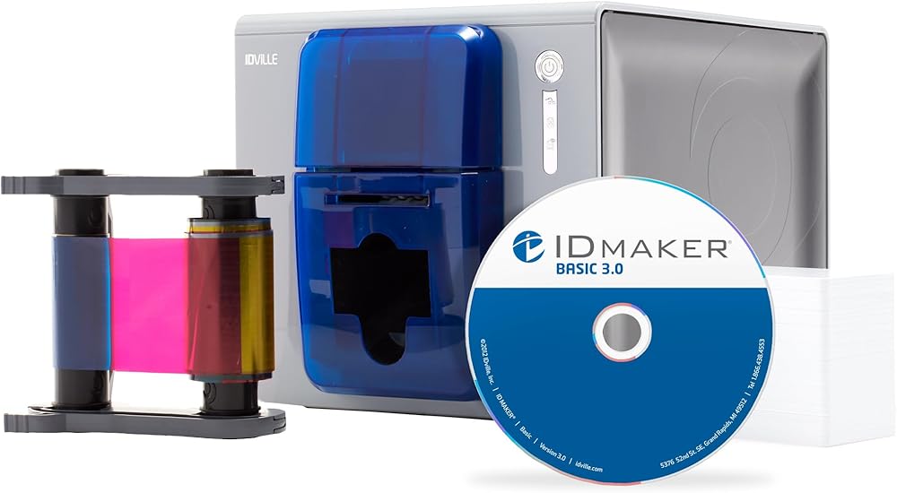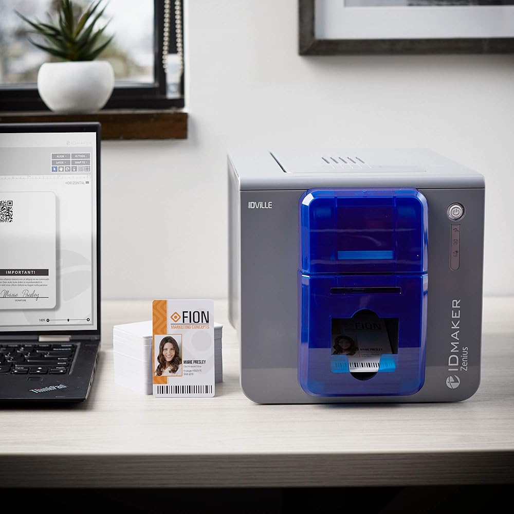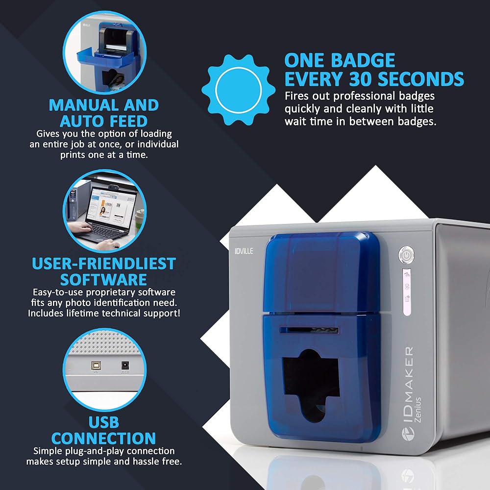 ماكينة طباعة بطاقات ID Maker Zenius ذات وجه واحد ومجموعة مستلزمات لطباعة الشارات - طباعة شارة تعريف الجودة الاحترافية - برنامج IDMaker، شريط ملون 200 طباعة، 200 بطاقة PVC