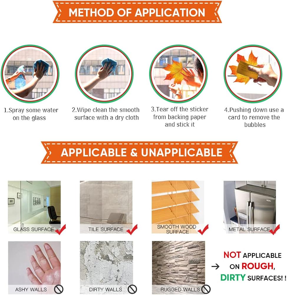 • سهلة الاستخدام: ملصقات النوافذ الخاصة بنا للديكورات الموسمية الخريفية هي ملصقات ثابتة بدون مادة لاصقة. فقط قم بتنظيف السطح الأملس، ثم قشر وألصق ملصقات النوافذ هذه على السطح. مثل الزجاج والمرايا والنوافذ وباب العاصفة الزجاجية والثلاجة.