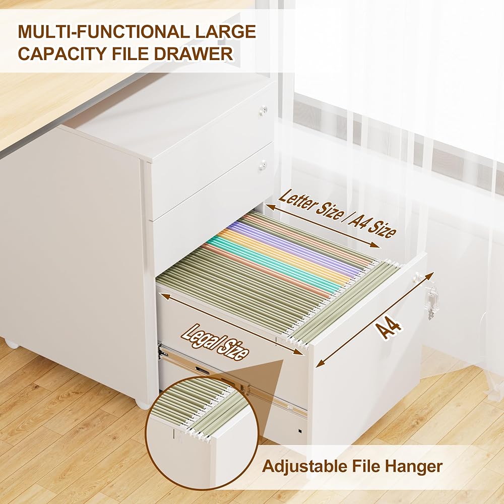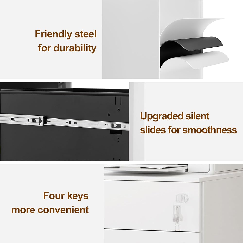 [أمان وثبات ممتازين]: عجلات مضادة للطرف مصممة خصيصًا أسفل الأدراج الكبيرة تضمن بقاء خزانة الملفات ثابتة وحتى إذا كان الدرج مليئًا بالملفات، فلن يسقط. يعمل النظام المتشابك والمفاتيح الأربعة على تعزيز الأمان وحماية مستنداتك المهمة، مما يجعله خيارًا مثاليًا للمكاتب المنزلية.