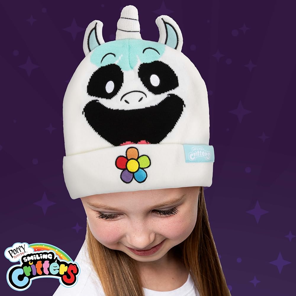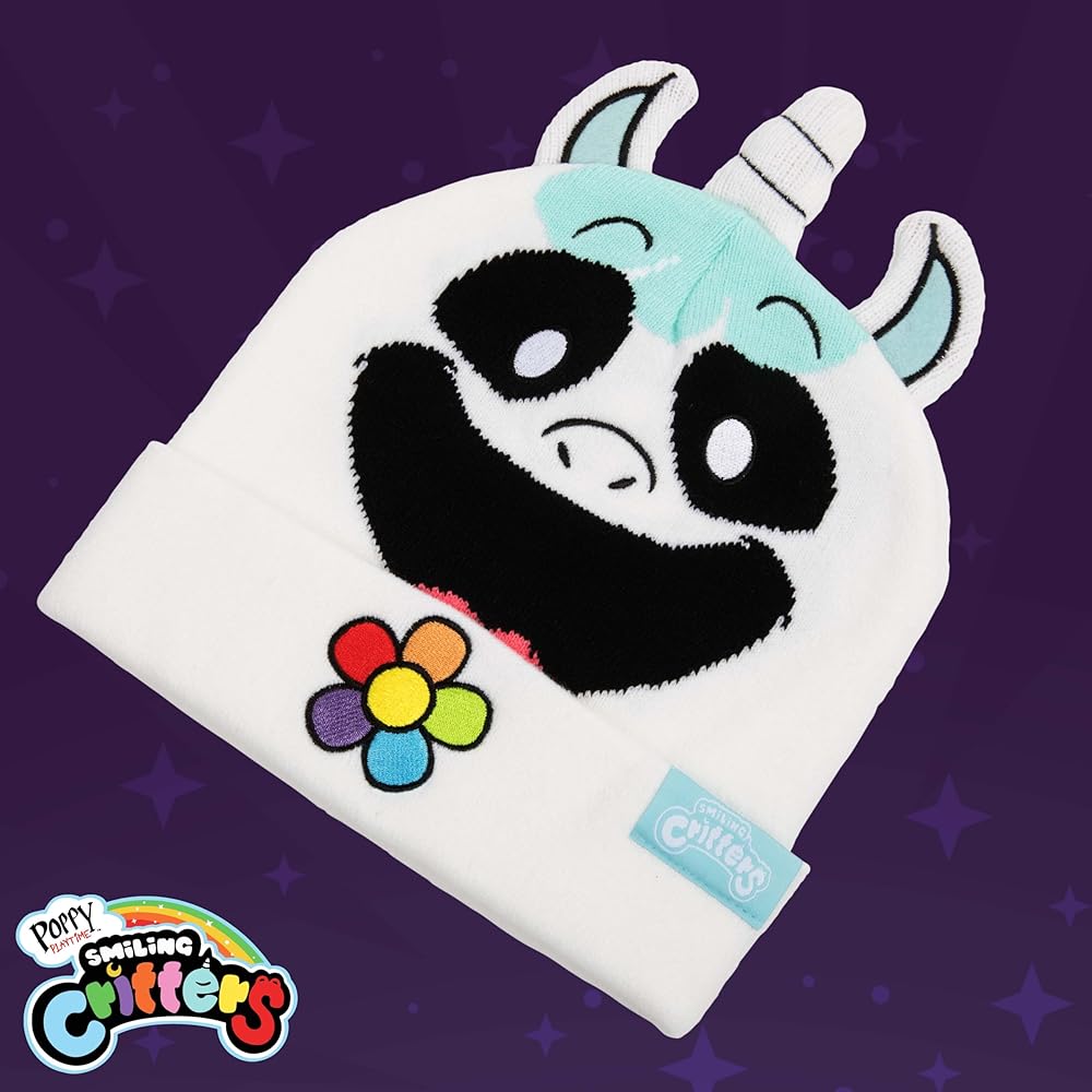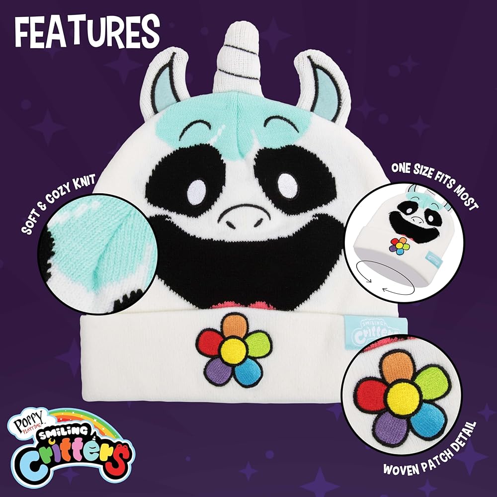 KNIT BEANIE: Cozy knit beanie hat from the hit game series, Poppy Playtime. Features Craftycorn's face in detailed embroidery, with 3D ears and a horn, plus a woven rainbow flower patch and branded label.