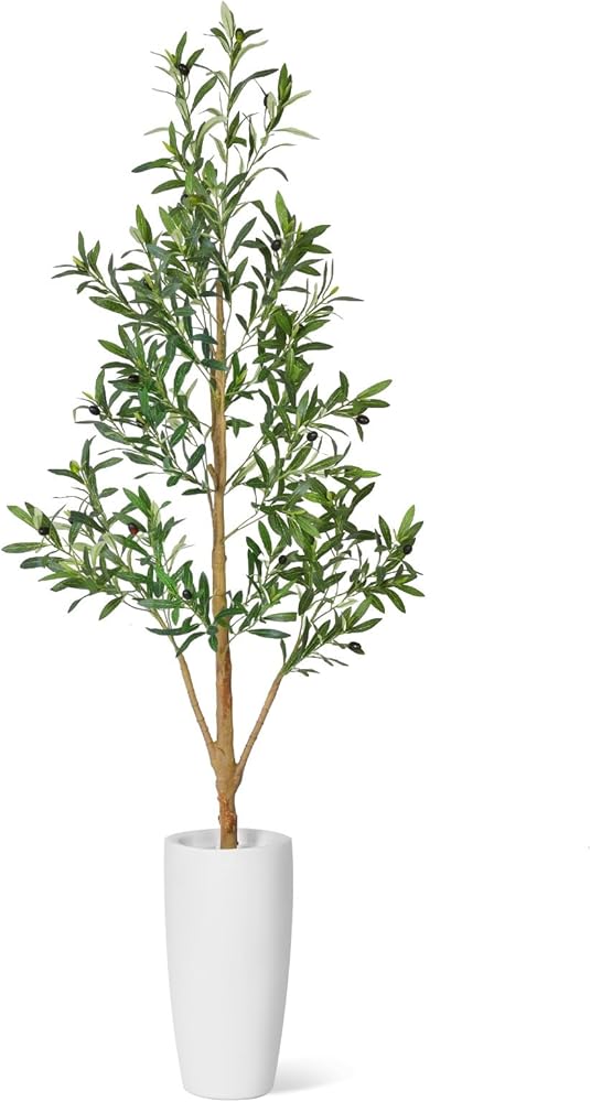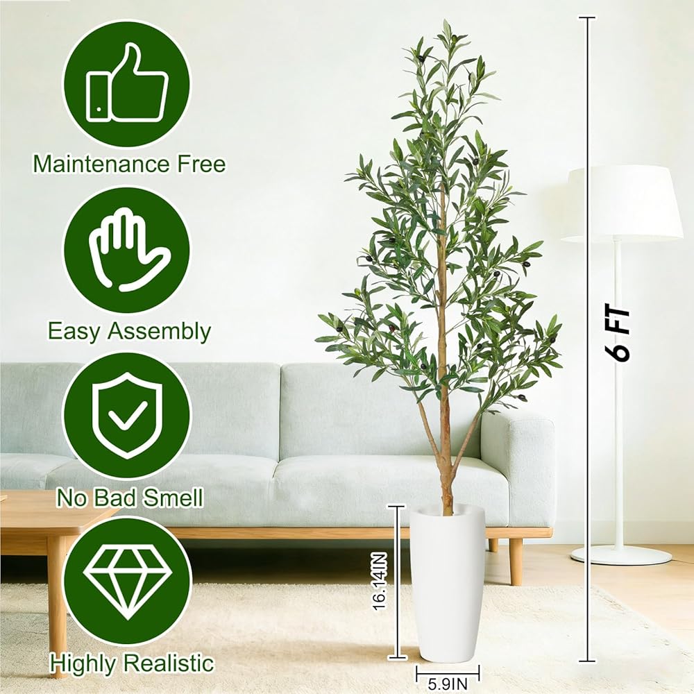 Timoo Faux Olive Tree 6Ft, Indoor Artificial Trees with Natural Wood Trunk and White Planter, Tall Fake Plants for Living Room, Bedroom and Office