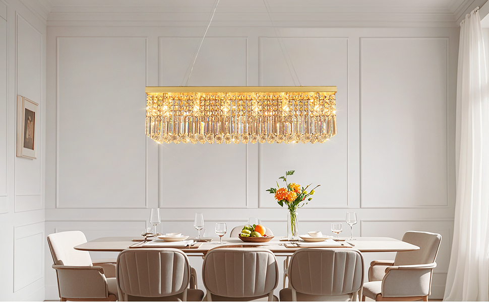 【الأبعاد】 يبلغ مقاس هذه الثريا الكريستالية المستطيلة 39.37 بوصة طولًا × 9.84 بوصة عرضًا × 11.02 بوصة ارتفاعًا. يمكن تعديل ارتفاع التعليق حسب الرغبة، حتى 58.85 بوصة. من خلال تغيير طول السلسلة، يمكن تكييفها بسهولة مع الأسقف العالية أو الأسقف المنخفضة، ويمكنك أيضًا رؤية تأثيرات الإضاءة المختلفة على السقف، مما يتكيف تمامًا مع ديكور منزلك.