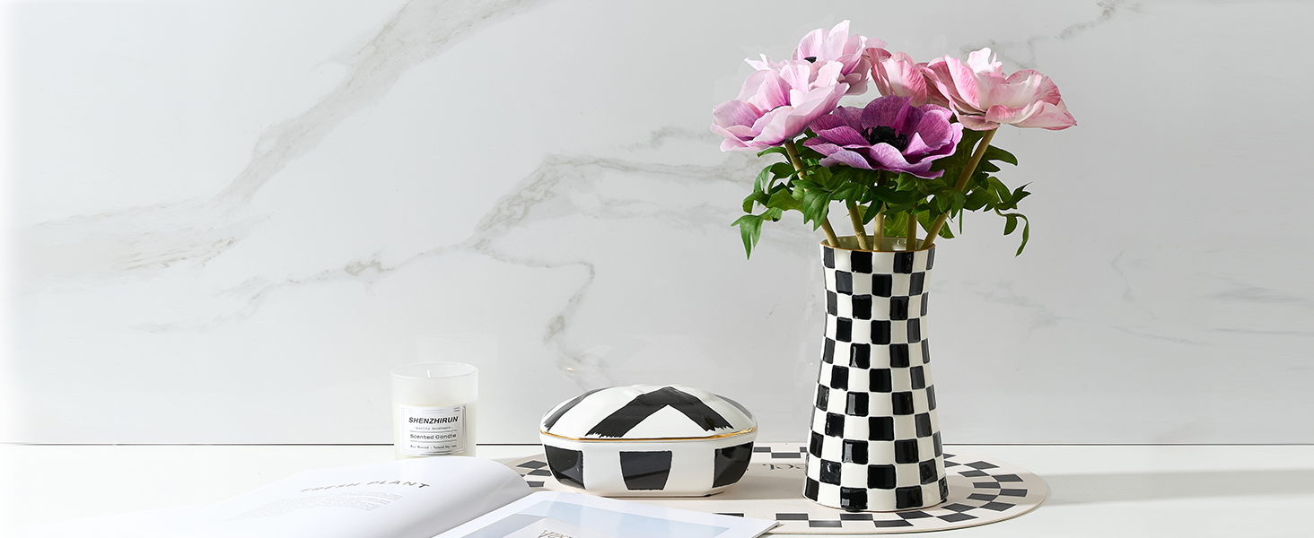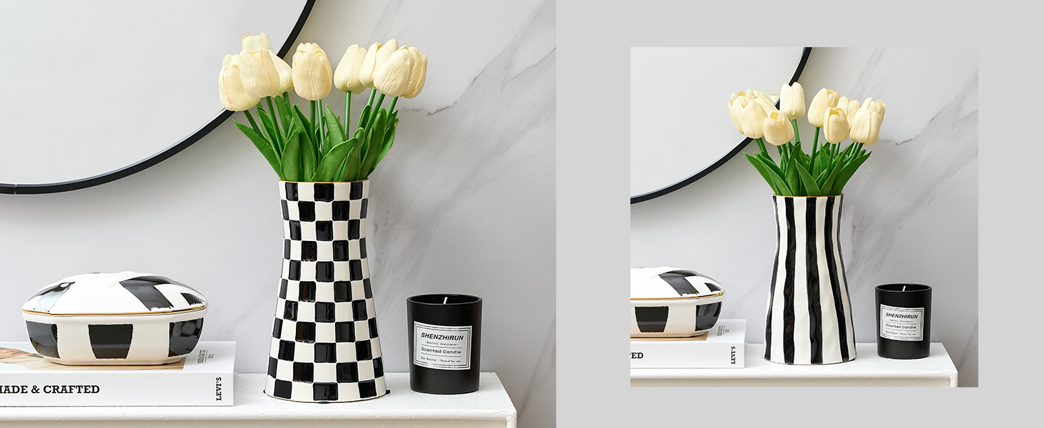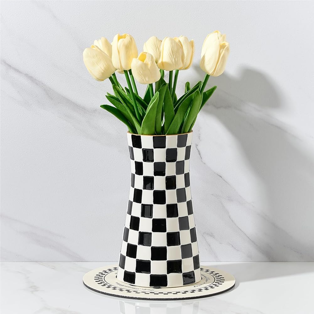 تصميم أنيق ومعاصر: يمنح النمط المربعات باللونين الأسود والأبيض هذه المزهرية مظهرًا عصريًا وجريءًا، مما يجعلها قطعة مميزة في أي غرفة. بفضل تصميمه الأنيق والبسيط، فإنه يكمل بسلاسة الأنماط الداخلية المختلفة، من الحديث إلى البسيط.