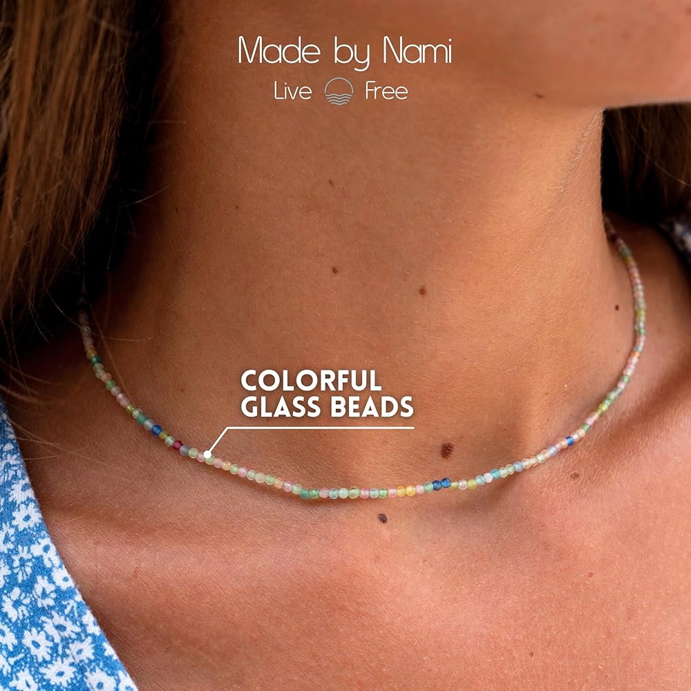 Elevate your everyday style with the Made by Nami Colorful Glass Bead Necklace, a piece that blends dainty elegance and boho charm. These colorful beaded necklaces for women features finely crafted pastel and rainbow seed beads, creating a playful yet sophisticated design that shines whether you're at the beach, a festival, or a casual day out. With its 16-inch long plus a 2-inch extender, this adjustable bead necklace for women can be worn as a snug minimalist beaded choker or a relaxed layering piece. Its versatile design makes it the perfect dainty layering necklace, complementing both casual outfits and chic evening looks. Handcrafted with love and inspired by tropical Bali vibes, this handmade bead necklace for women is lightweight, waterproof, and fade-resistant, ensuring lasting beauty. It's not just jewelry – it's a piece of art you can wear every day. Whether you're shopping for yourself or looking for the perfect birthday gift for her necklace, Valentine's Day gift necklace for women, or Mother's Day jewelry beaded necklace, this dainty beaded choker necklace for women makes a meaningful choice. Add a touch of color, charm, and elegance to your jewelry collection with this colorful seed bead necklace – your new favorite go-to accessory for all seasons.