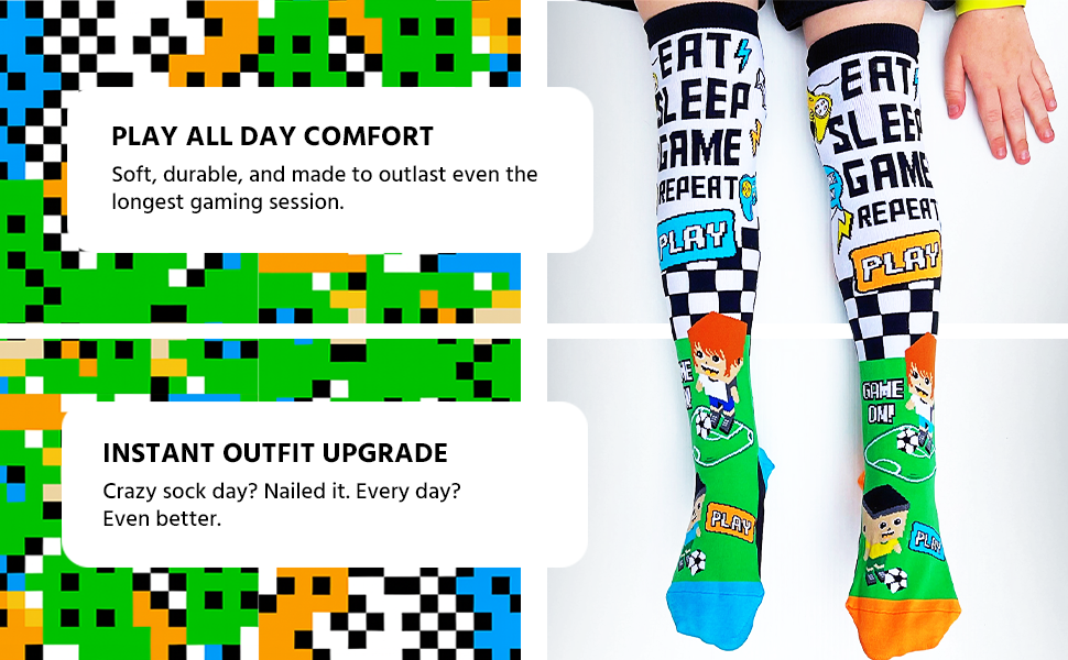 جوارب الألعاب: جوارب الألعاب هنا للمساعدة في رفع لعبتك إلى أعلى مستوى. مع هذه الجوارب الرائعة ووحدة التحكم الخاصة بك، يمكنك تسوية ساحة اللعب والخروج بالفوز! اللعبة على!