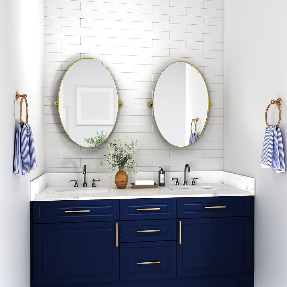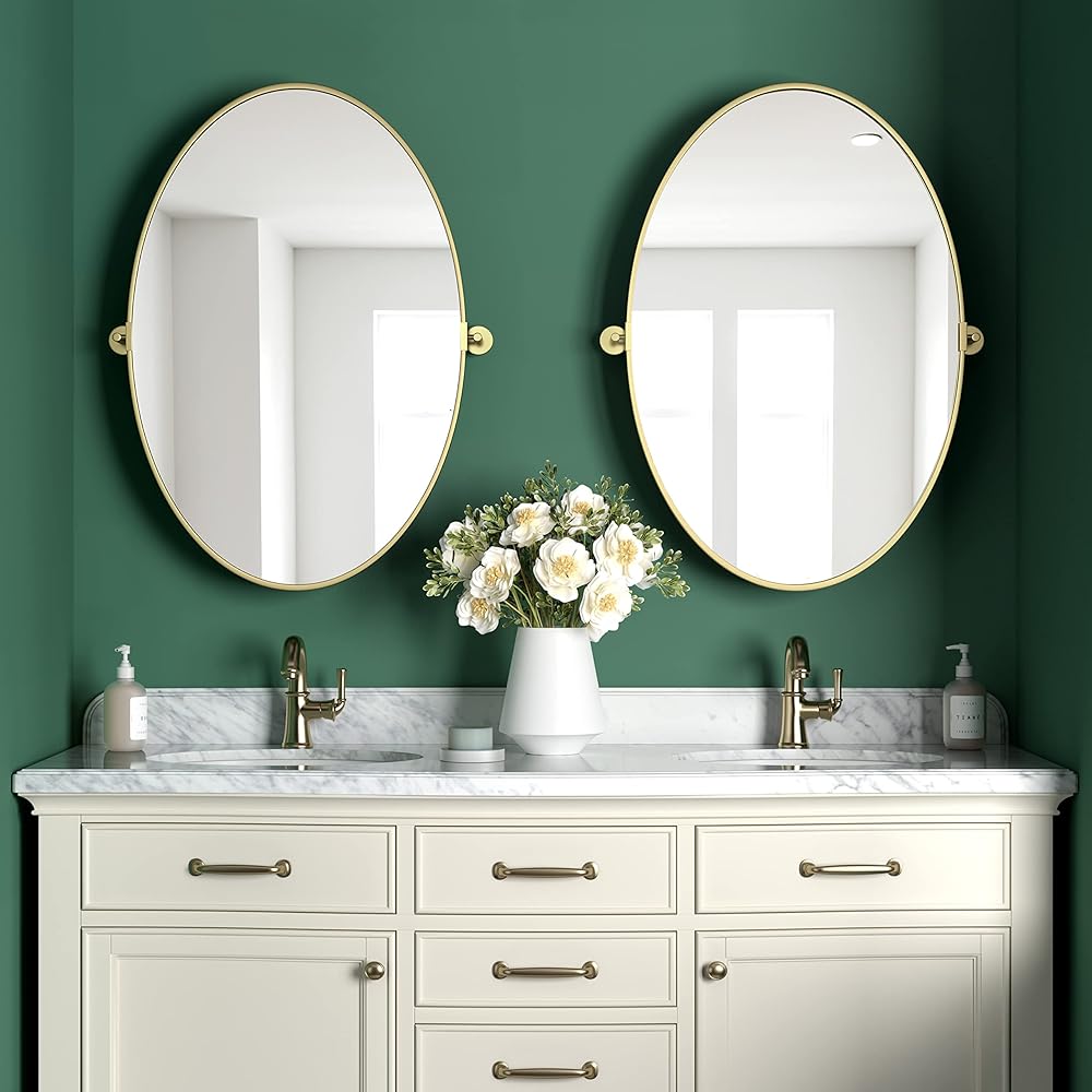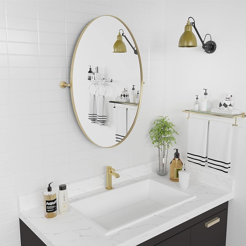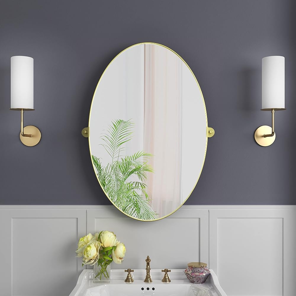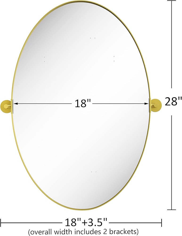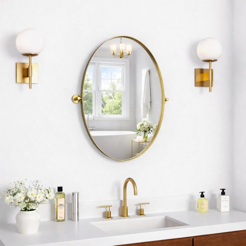 مرآة بيضاوية محورية مقاس 18 × 28 بوصة مرايا حائط مائلة معدنية ذهبية لغرفة المعيشة في الحمام | إطار قابل للتعديل وزجاج مقاوم للكسر