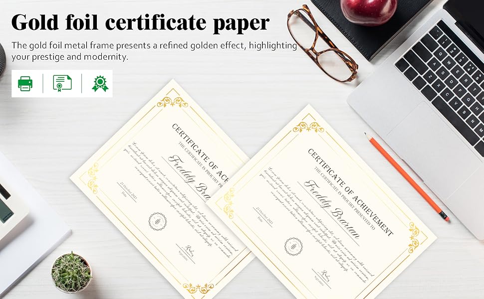 توافق الطابعة بدون جهد: احصل على نتائج احترافية من منزلك أو مكتبك. تم تصميم ورقة الجائزة هذه بدقة لتكون متوافقة بنسبة 100% مع معظم طابعات الحبر والليزر. يضمن الملمس الناعم طباعة خالية من التلطخ، مما يسمح للنص والتوقيعات المخصصة الخاصة بك بالظهور بوضوح.