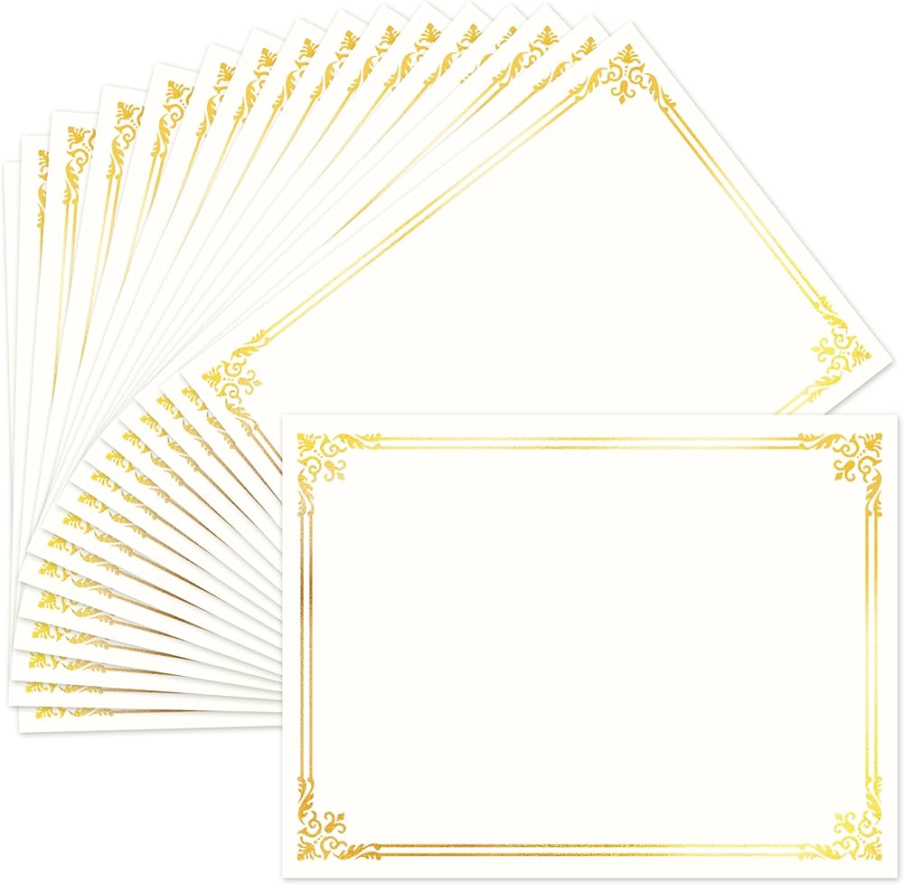 صناعة رقائق ذهبية رائعة: ارفع احتفالات التقدير الخاصة بك من خلال ورق الشهادات المتميز الخاص بنا. تحتوي كل مجموعة على 50 ورقة من الورق بحجم الحروف القياسي (8.5 × 11 بوصة)، وتتميز بحدود معدنية ذهبية منقوشة بشكل مذهل. يضيف التصميم المعقد لمسة من الهيبة والأناقة المهنية إلى أي دبلوم أو جائزة.
