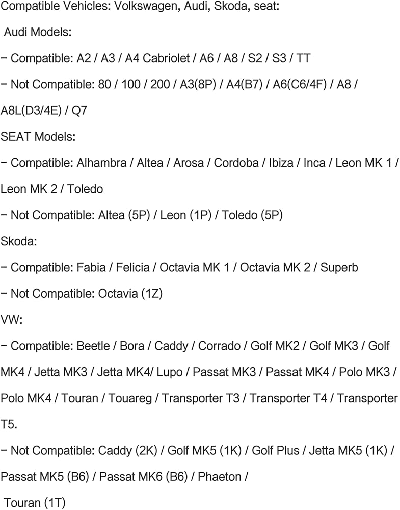✅ Compatible: Beetle, Bora, Caddy, Corrado, Golf MK2/MK3/MK4, Jetta MK3/MK4, Lupo, Passat MK3/MK4, Polo MK3/MK4, Touran, Touareg, Transporter T3/T4/T5