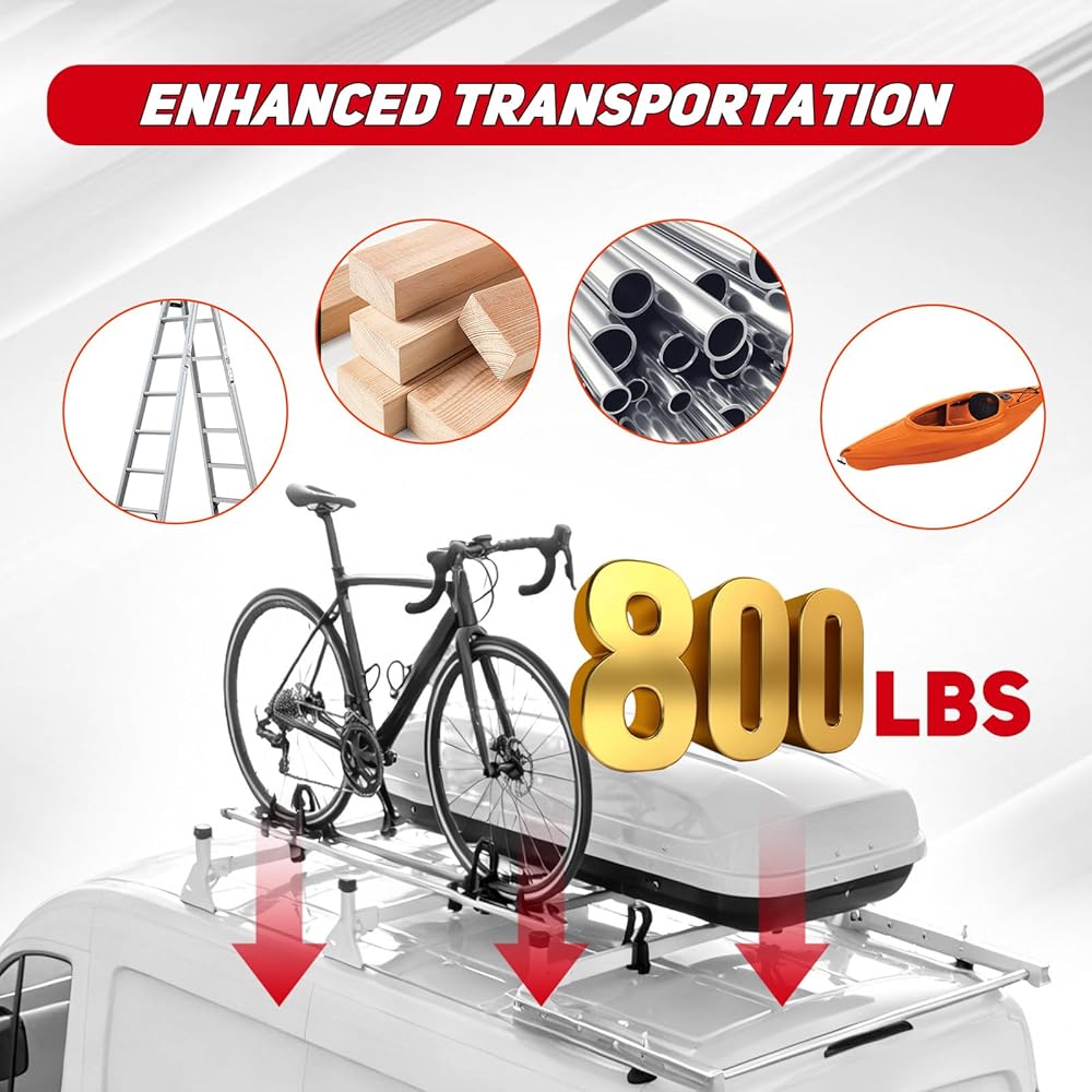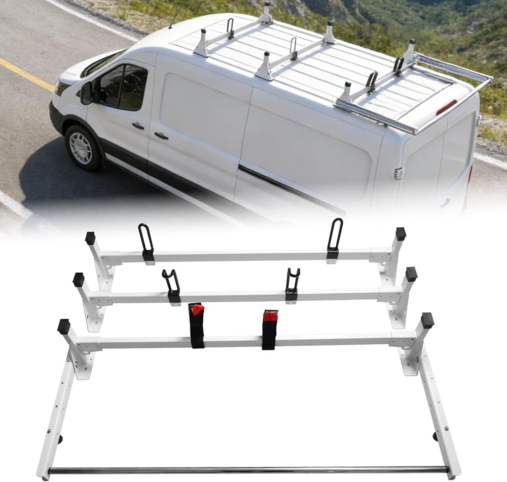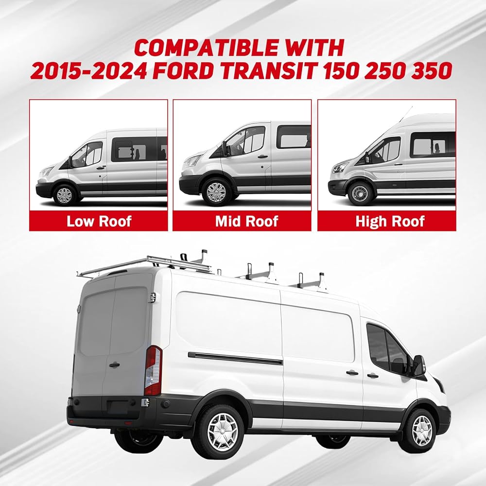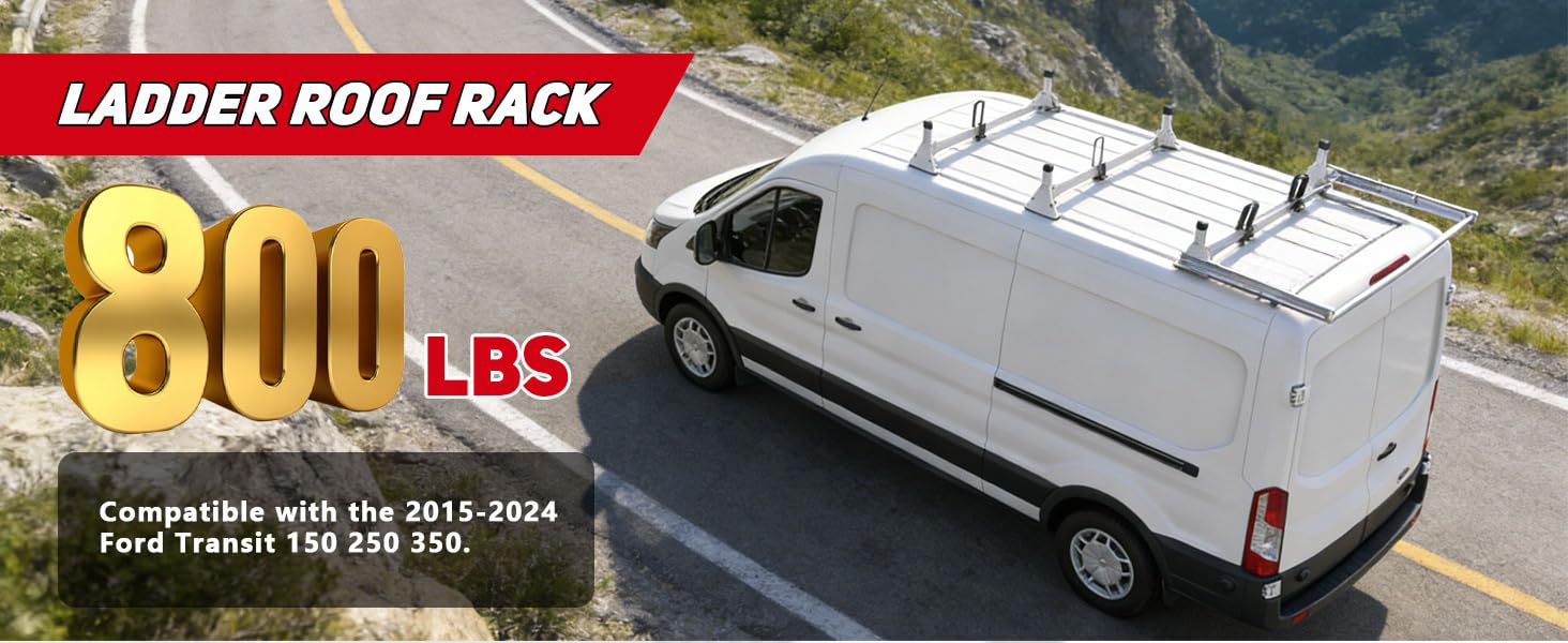 • الملاءمة: رف سلم فان مناسب لموديلات 2015-2024 Ford Transit 150، 250، 350. ملحوظة: غير مناسب لـ Transit Connect. أقصى سعة للحمل: 800 رطل.