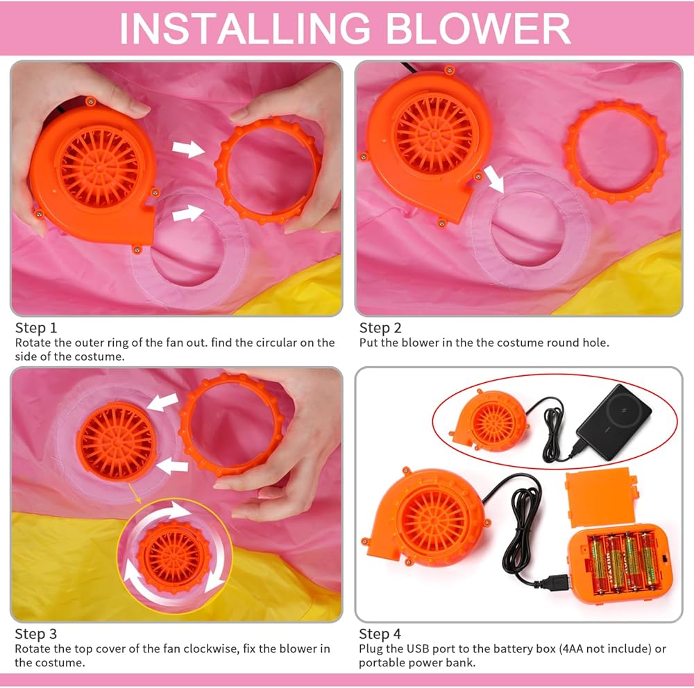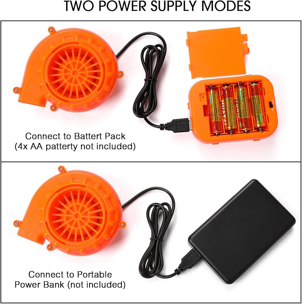 ✅ خيارات الطاقة – تعمل باستخدام 4 بطاريات AA أو مصدر طاقة محمول. تشتمل العبوة على زي واحد ومروحة واحدة قابلة لإعادة الشحن والإكسسوارات الضرورية للاستخدام الفوري.