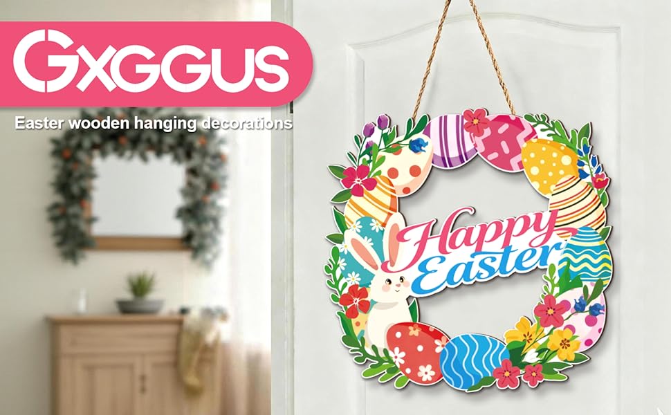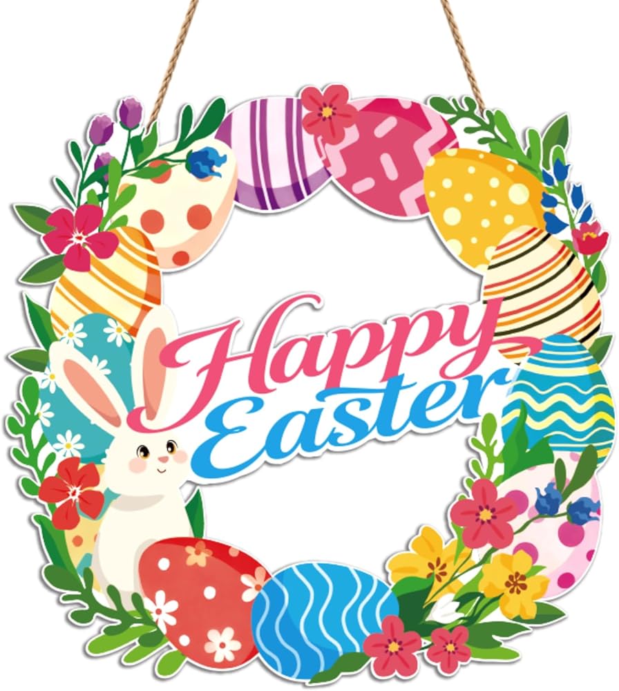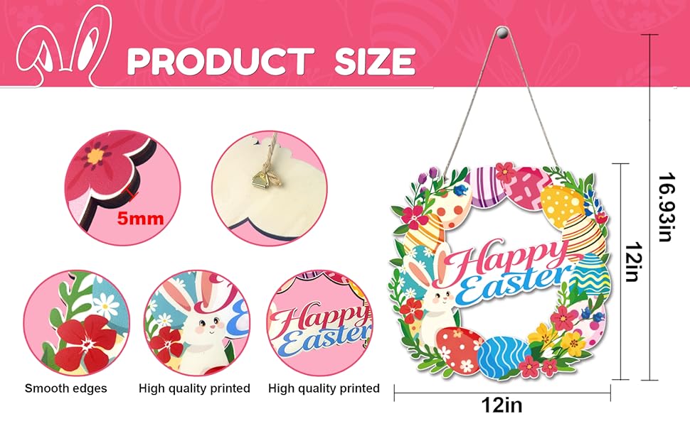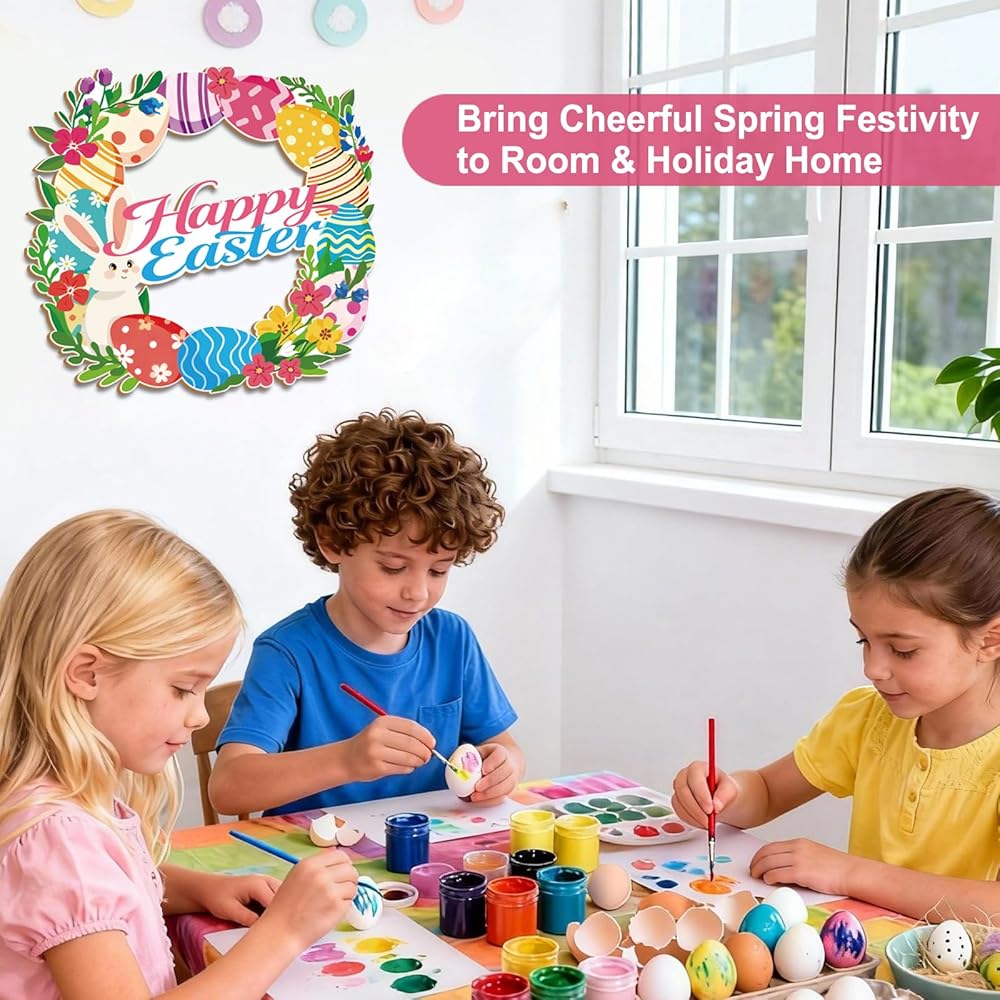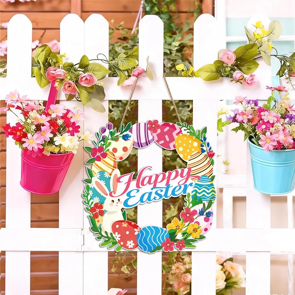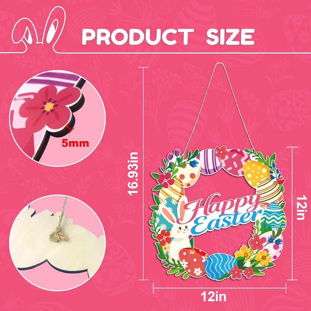 • ديكور عيد الفصح اللافت للنظر: إكليل خشبي مقاس 12 بوصة مع طباعة نابضة بالحياة للأرانب وبيض عيد الفصح وزهور الربيع، مثالي لديكور عيد الفصح الداخلي والخارجي.
