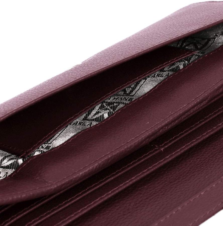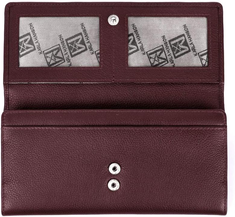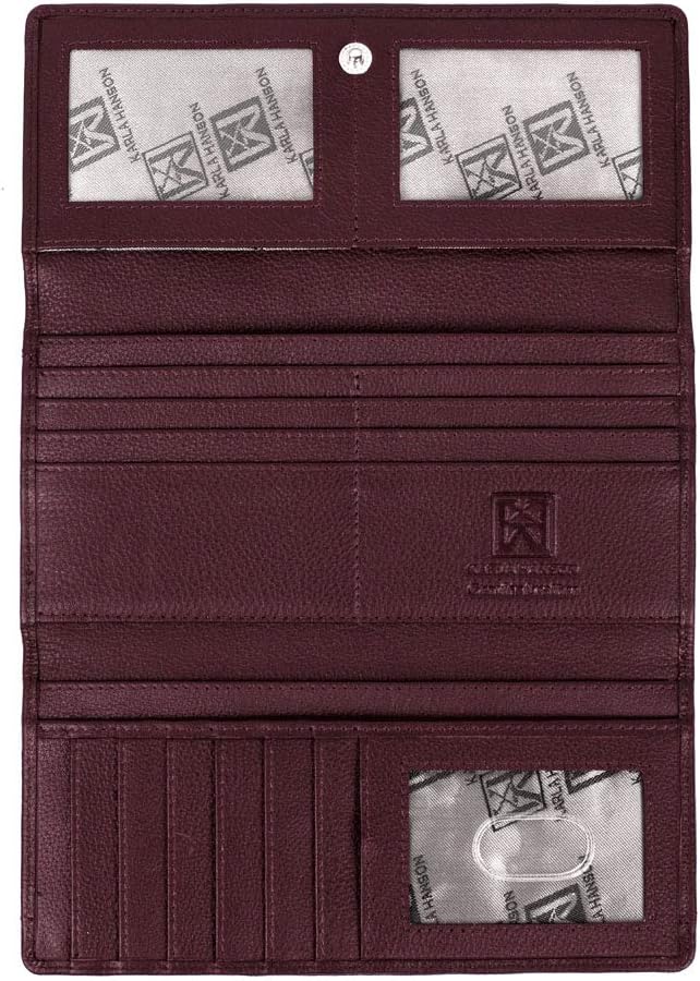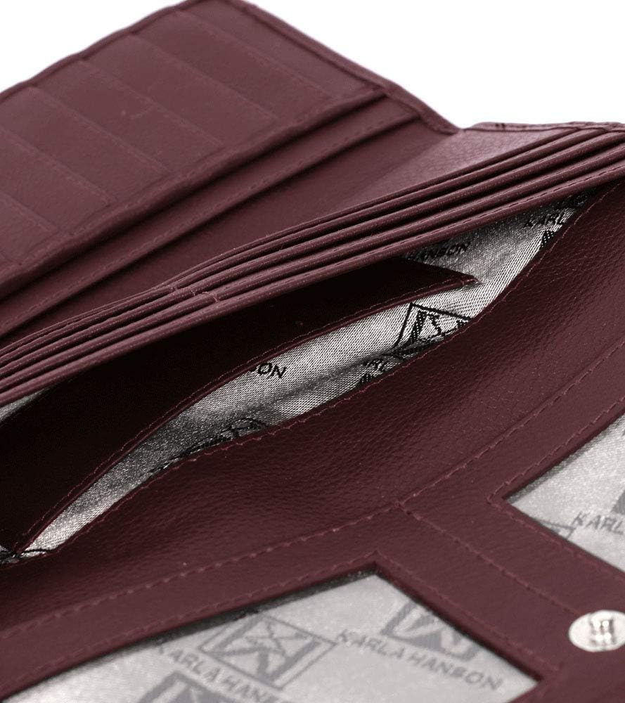 The comprehensive organization of our KARLA HANSON Women's Envelope Wallet meets the convenience of a trifold in this accessible snap-close design. Durable yet refined in textured pebble leather, it allows you to see everything inside at a glance. Built in RFID defender technology protects your ID and credit cards.