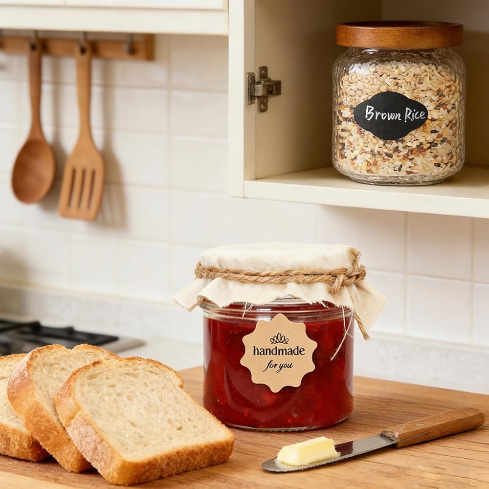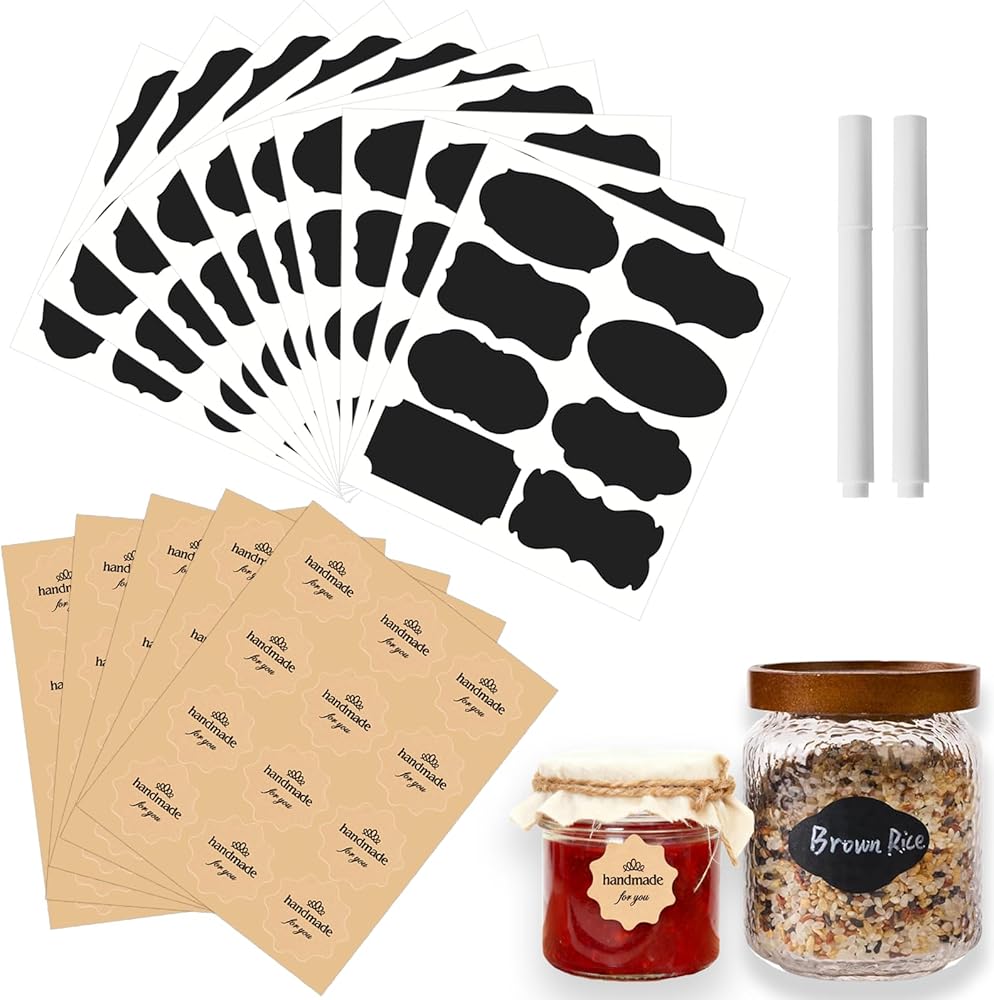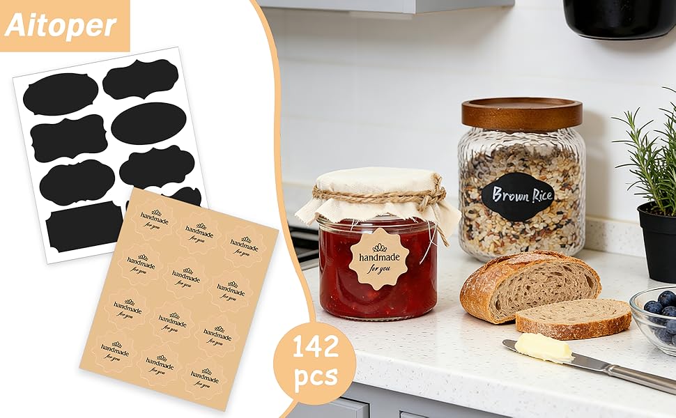مادة فاخرة: ملصقات السبورة السوداء مصنوعة من مادة الفينيل المتينة والفائقة. ملصقات "Handmade for You" مصنوعة من ورق كرافت سميك وعالي الجودة. معًا، فهي مثالية لتخزين الطعام واحتياجات الصناعة.
