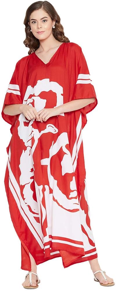 Our kaftan for women is made in high quality polyester fabric that feels luxurious and is ideal for casual as well as everyday wear. The lightweight polyester fabric is breathable and comfortable, making it an ideal choice for summer wear. It moves with your body for added comfort, whether you're lounging at home or attending a special event. This kaftan dress for women is high in style and low in price. Long printed kaftans are versatile and stylish wear for a beach day or a casual hangout. The casual caftan dress with intricate pattern gives a sophisticated finish along with 3/4 kimono sleeves with styled border design. Available in plus size kaftans are your way to a stylish wardrobe for your special occasions. Kaftan dress is the perfect wear for your daily wear as well as party wear. The timeless print on the kaftan is perfect party-wear to make you shine in glam. Wrinkle-Free Fabric: Forget about ironing! This kaftan is crafted with a special wrinkle-resistant fabric, ensuring it stays smooth and fresh-looking even after long wear or packing. Shrink-Free: Made from durable, high-performance polyester, this kaftan is designed to retain its size and shape after washing, so you never have to worry about it shrinking. A slight variation may occur in colors and size specifications. Colors may appear slightly different via website due to computer picture resolution and monitor settings as compared to the colors true to the pictures.
