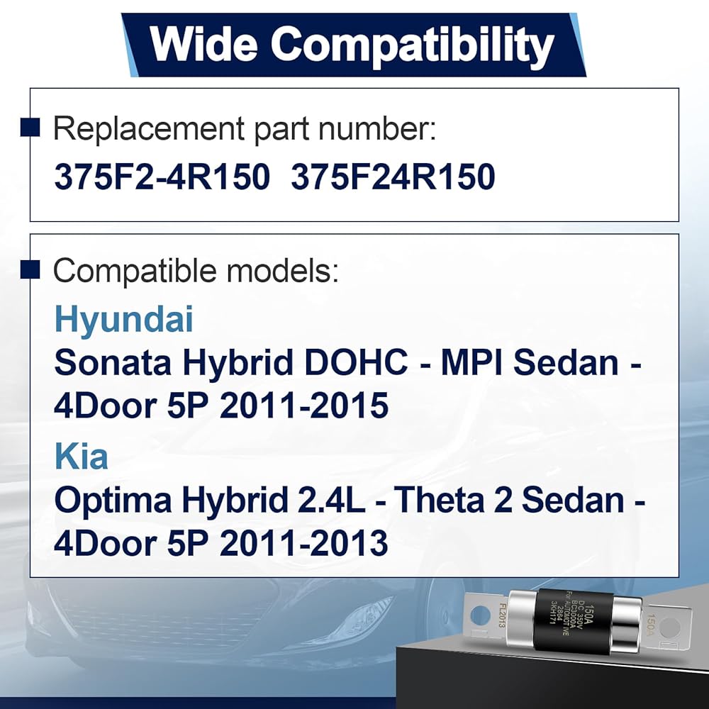 • الطرز المتوافقة: هذا المصهر عالي الجهد 375F2-4R150 يناسب موديلات 2011-2015 Hyundai Sonata Hybrid 4 أبواب و5 مقاعد، 2011-2013 Kia Optima Hybrid 2.4L 4 أبواب و5 مقاعد. يناسب هذا المصهر عالي الجهد أيضًا طرازات 2014-2016 Azera Hybrid وGrandeur.