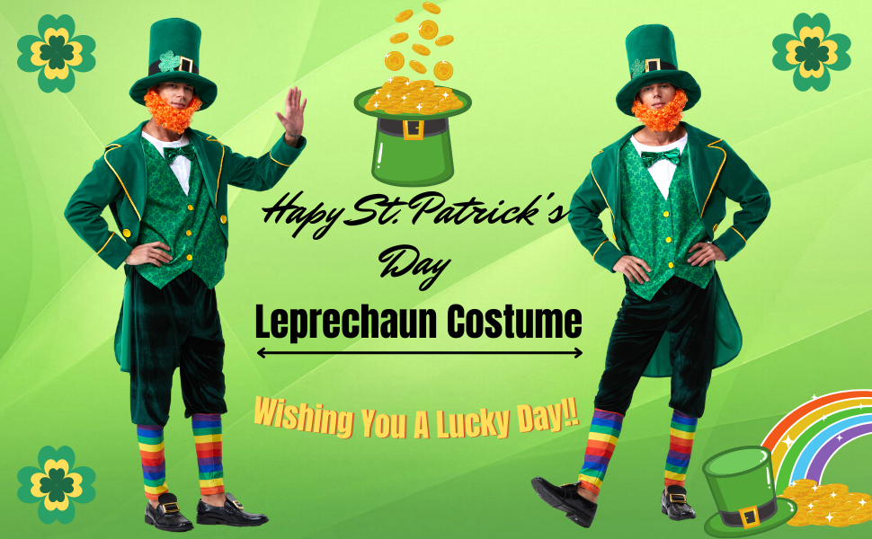 ميزات زي Lucky Charms الرجالي: يعتمد زي الجني الشبابي هذا اللون الأخضر النموذجي، ويتميز بسترة مخملية ذات ياقة خضراء مع زخرفة ذهبية، وأزرار زخرفية ذهبية مزخرفة؛ نمط طباعة ذهبي بأربع أوراق البرسيم أمام السترة، وله أزرار في المنتصف الأمامي؛ تتميز السراويل بنمط قوس قزح عند الأصفاد التي تقع أسفل الركبتين مباشرةً. يبدو تصميم زي العرض الأيرلندي الكامل هذا أنيقًا للغاية ومليئًا بالنكهة الأيرلندية ويضيف المزيد من السعادة لك