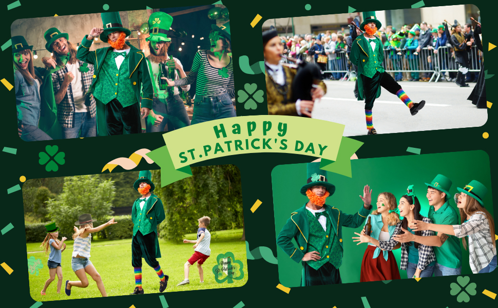 لمعظم المناسبات: زي الجني الفاخر مناسب لموكب عيد القديس باتريك، وحفلات اسكتلندا وأيرلندا، والهالوين، والحفلات التنكرية، والعروض، وحفلات الرقص، وحفلات الفساتين، وأعياد الميلاد وغيرها من الاحتفالات. نمط خاص لافت للنظر من سترة البرسيم ذات الأربع أوراق يمكن أن يكون أيضًا هدية مدهشة لعائلتك وأصدقائك والآخرين. زي سانت باتي هذا سيجعل الجميع في الحفل يشعرون بسحر الحظ الأيرلندي