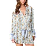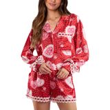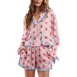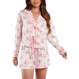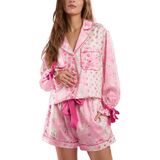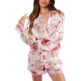 الساتان الممزوج بالشريط يبدو فاخرًا للغاية! تحقق من قميص البيجامة الجميل ذو الأزرار السفلية، مع غطاء مطبوع على شكل قلب/فيونكة/أزهار/فاكهة. يتميز هذا المنتج بياقة، وجيب أمامي واحد على الصدر، وأكمام طويلة منتهية بسوار على شكل فيونكة. مثالية لوقت النوم أو للاسترخاء المريح. احصل على الشورتات المطابقة واستعد للموضة أثناء نومك