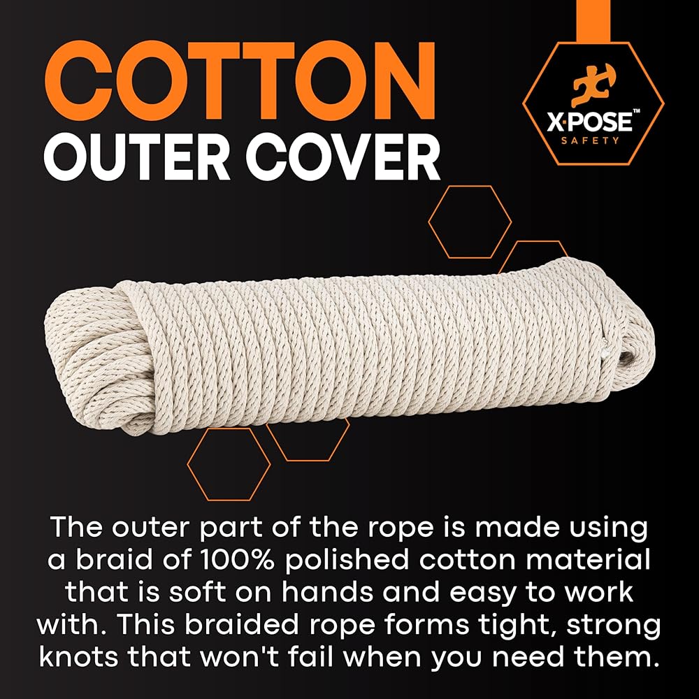 غطاء خارجي من القطن - الجزء الخارجي من الحبل مصنوع باستخدام جديلة من مادة القطن المصقولة بنسبة 100%، وهي ناعمة على اليدين وسهلة العمل بها. يشكل هذا الحبل المضفر عقدًا محكمة وقوية لن تفشل عندما تحتاج إليها.