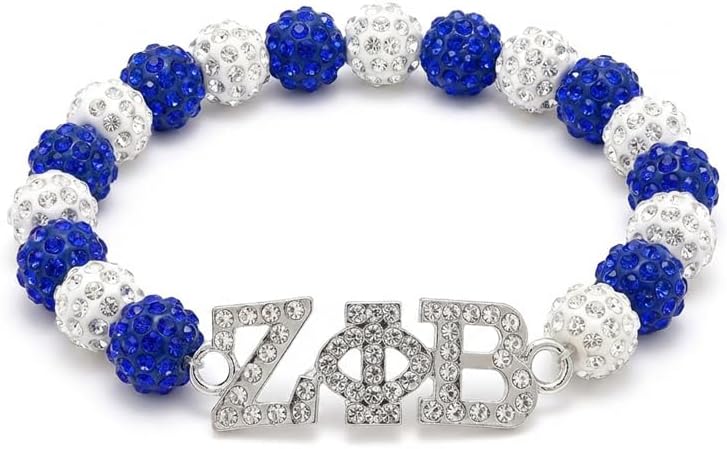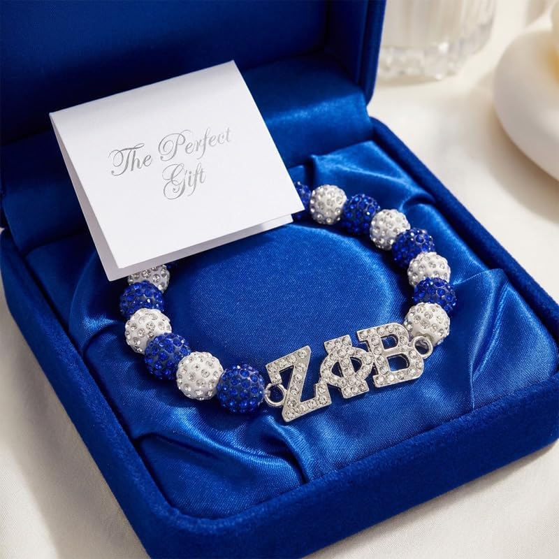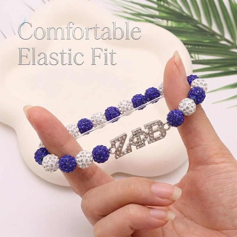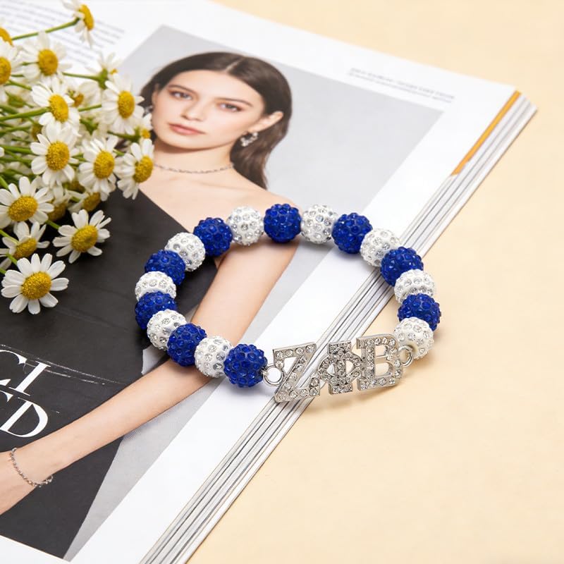 • Classic Design: This bracelet features a fashion design with alternating blue and white crystal beads, reflecting traditional sorority colors. The centerpiece is a finely crafted alloy charm that prominently displays the Greek letters “ΖΦΒ.” The entire strand is accented with sparkling rhinestones embedded within the beads, blending elegant symbolism with chic style.