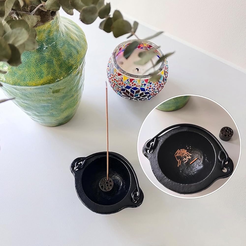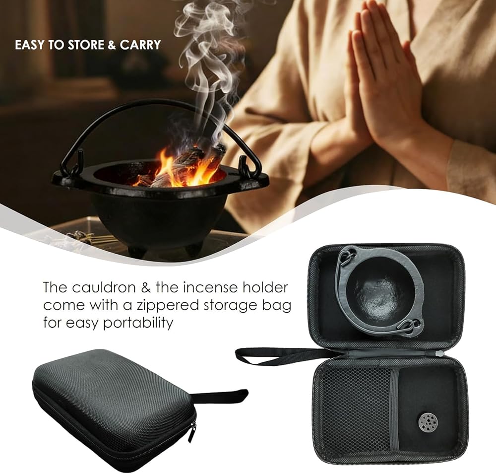 COMPLETE INCENSE SET: Cast iron cauldron incense burner comes with a protective traveling case and incense stick holder for a complete smudging and ritual experience