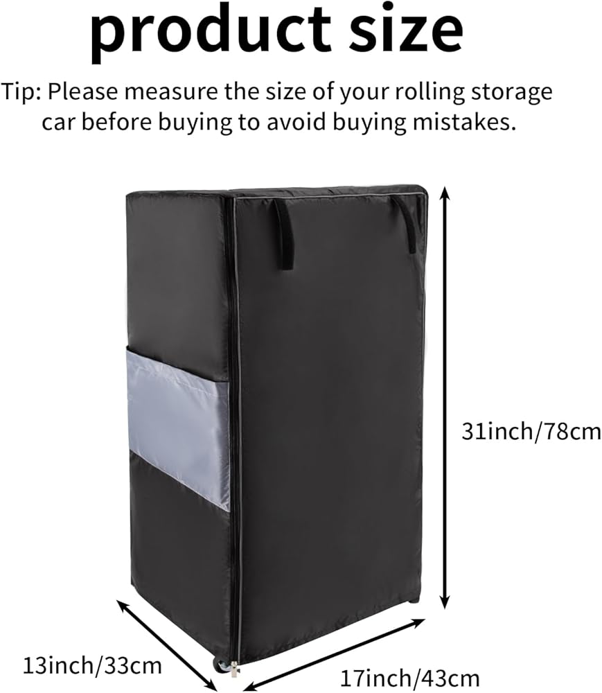 Utility Cart Cover without Rolling Cart: The protective cover fits size of Rolling Cart is about 17" Lx13''Dx31''H, allowing you to place the sundries in a place where you can hide it.Please confirm the size of your Rolling Cart before purchase