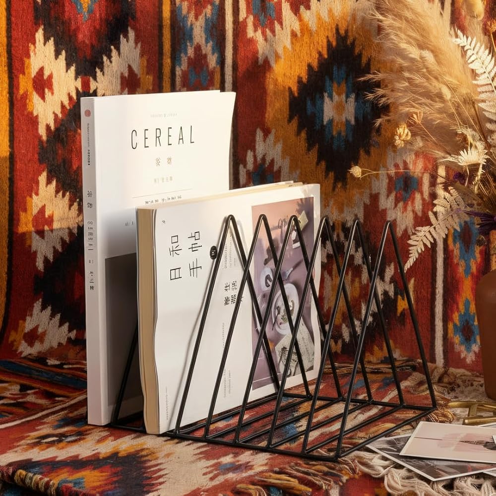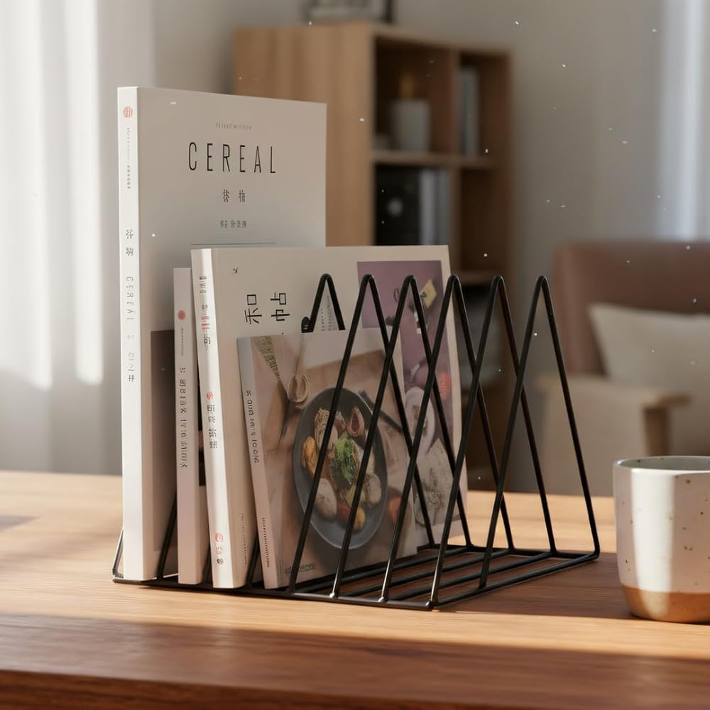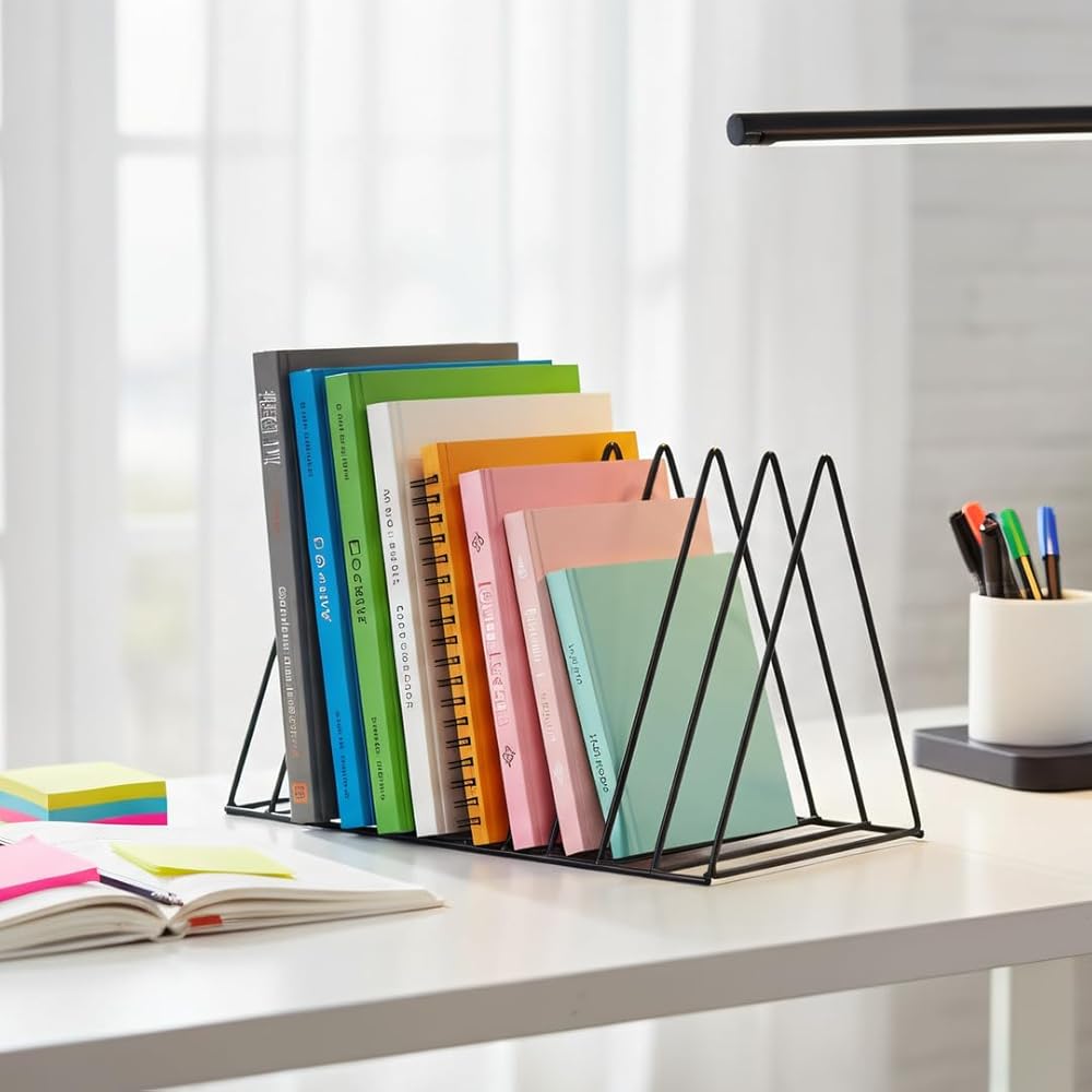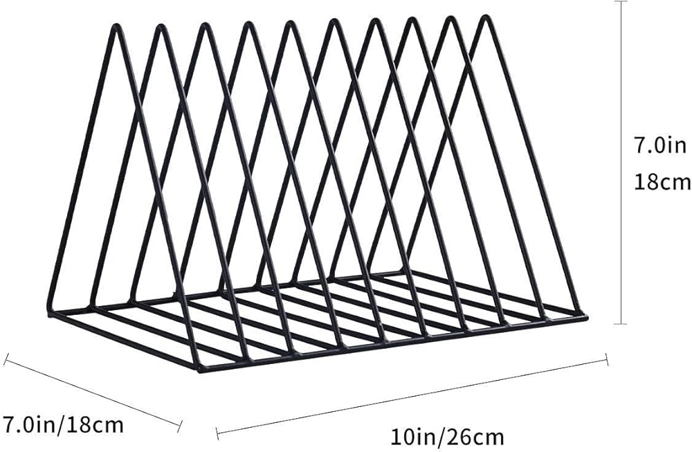 Elevate your desktop organization with this sophisticated 9-section vertical file organizer. The triangular metal design features an expandable that's perfect for sorting documents, magazines, vinyl records, and more. At 10 inches deep, 7 inches wide, and 7 inches tall, this versatile rack maximizes vertical space while maintaining a compact footprint. The durable black metal wire construction ensures stability, while the geometric pattern adds a modern aesthetic to any office setting. Each section is perfectly sized to accommodate standard letters, folders, and documents, keeping them upright and easily accessible. The expandable design allows for flexible storage capacity, making it ideal for managing everything from daily mail to important paperwork. Whether placed on a desk, shelf, or countertop, this organizer combines practical functionality with contemporary style. Its versatile design makes it suitable for use in home offices, professional workspaces, classrooms, or creative areas, helping maintain order while complementing any decor.