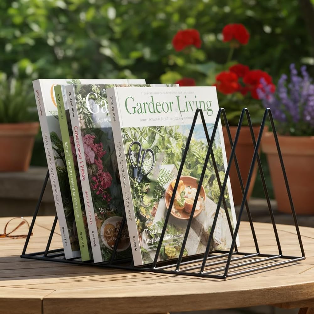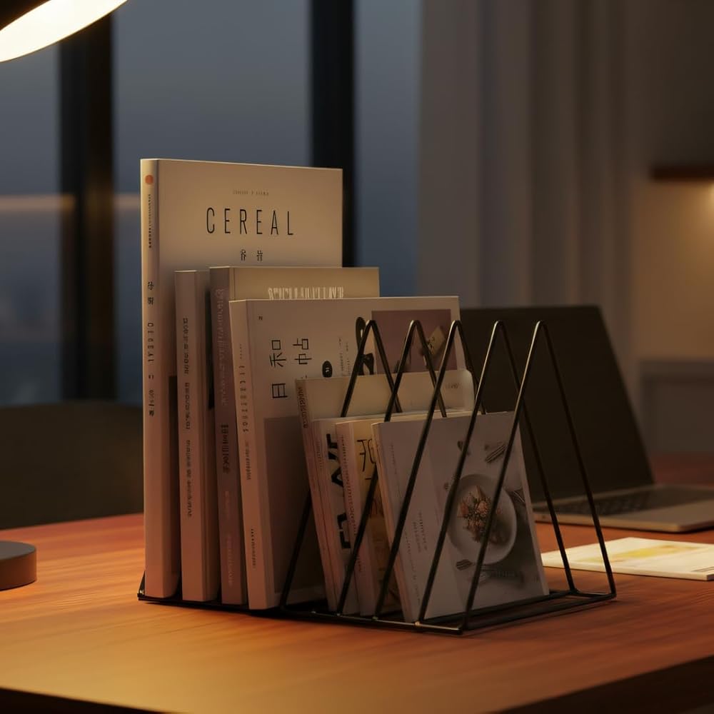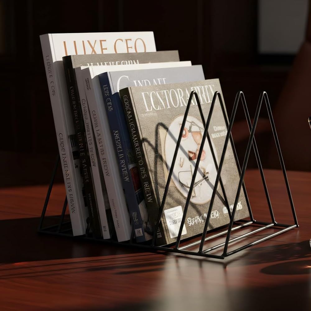 Elevate your desktop organization with this sophisticated 9-section vertical file organizer. The triangular metal design features an expandable that's perfect for sorting documents, magazines, vinyl records, and more. At 10 inches deep, 7 inches wide, and 7 inches tall, this versatile rack maximizes vertical space while maintaining a compact footprint. The durable black metal wire construction ensures stability, while the geometric pattern adds a modern aesthetic to any office setting. Each section is perfectly sized to accommodate standard letters, folders, and documents, keeping them upright and easily accessible. The expandable design allows for flexible storage capacity, making it ideal for managing everything from daily mail to important paperwork. Whether placed on a desk, shelf, or countertop, this organizer combines practical functionality with contemporary style. Its versatile design makes it suitable for use in home offices, professional workspaces, classrooms, or creative areas, helping maintain order while complementing any decor.