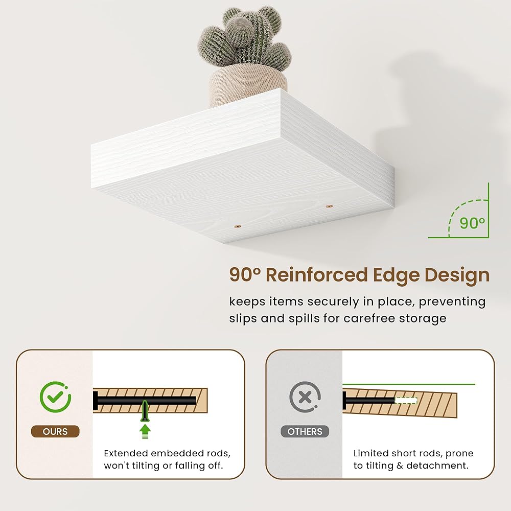 [أرفف عالية الجودة]: أرففنا العائمة المربعة مصنوعة من مادة MDF عالية الجودة مع سطح أملس ومشرق. ليست فقط مقاومة للخدش ومقاومة للماء، ولكنها تتمتع أيضًا بأداء ممتاز للحمل. مع التركيز على الجمال والجودة، هذا الرف الذي يبلغ عرضه 8 بوصات × 8 بوصات عمق هو منتج فعال للغاية من حيث التكلفة.
