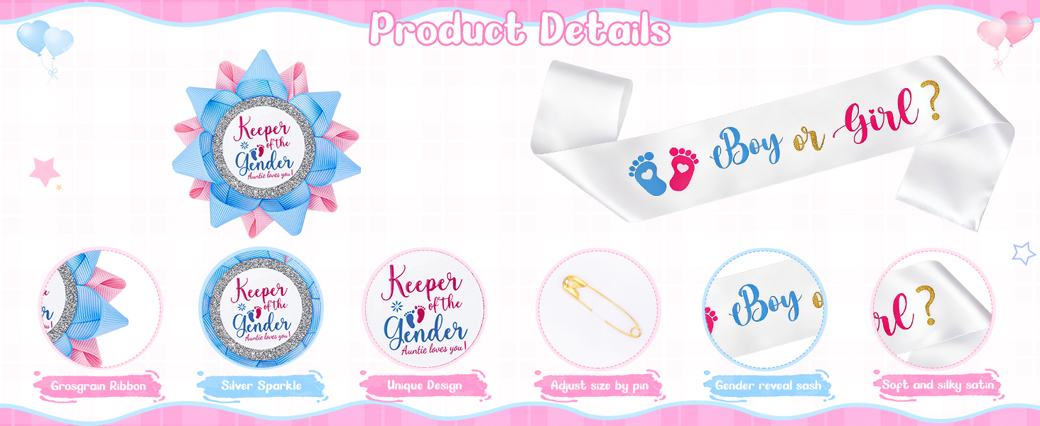 Premium Fabric And Ribbon: Soft durable sash material and secure metal pin hardware designed for comfortable wear during baby reveal ideas and baby shower festivities.