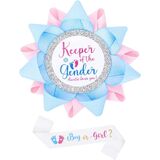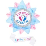 Includes Pins And Sash: One keeper of the gender pin and one gender keeper sash packaged in a kraft box for easy gifting and team boy or girl pins at a gender reveal party.