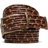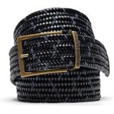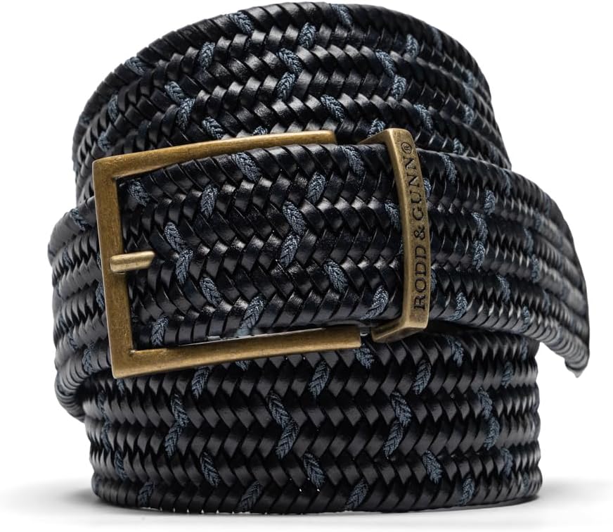 The Stratford belt is made from 75% leather that is precisely woven with contrast viscose fabric as a feature trim and a rubber material to add stretch for greater comfort. The belt end features an embossed English Pointer that is stitched to an antique finished Zamac buckle that features the Rodd & Gunn logo on the buckle.