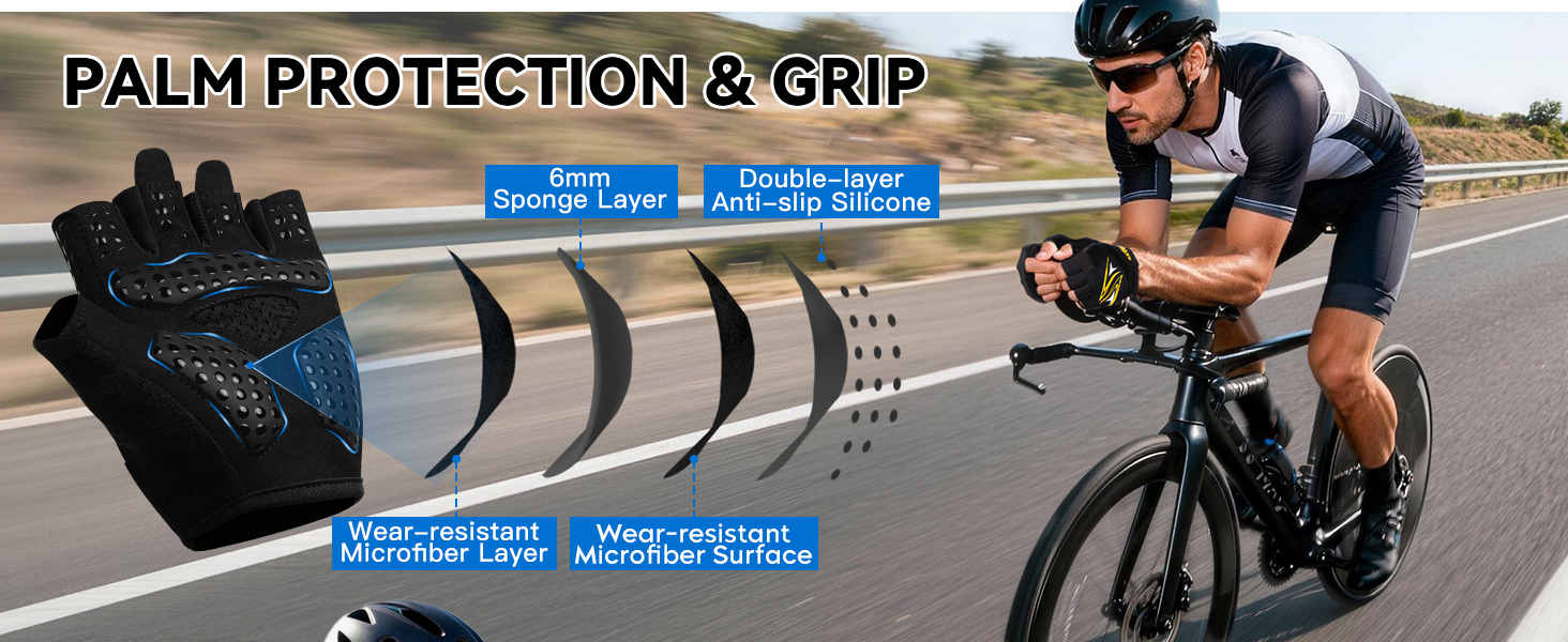 • قبضة وتحكم معزز: مثالية لجميع أنواع ركوب الدراجات، تتميز قفازات ركوب الدراجات بميزة السيليكون المضادة للانزلاق لتعزيز الإمساك والتحكم في المقاود. يضمن السيليكون عالي الجودة قبضة محكمة في ظل الطقس القاسي، مما يوفر تحكمًا مثاليًا أثناء ركوب الدراجات.