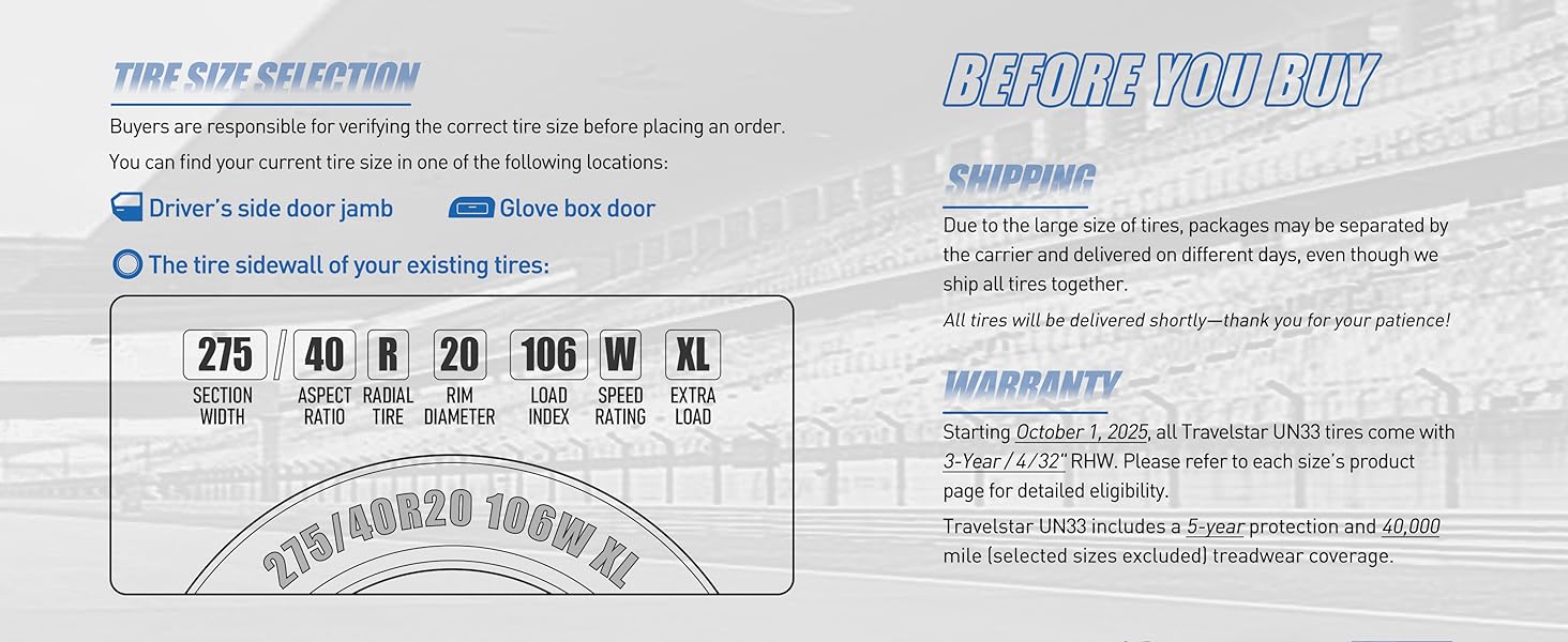 • الأخاديد المحيطية: تعمل أربع قنوات تصريف واسعة على منع الانزلاق المائي بشكل فعال مع توفير قوة جر يمكن الاعتماد عليها في جميع الفصول.